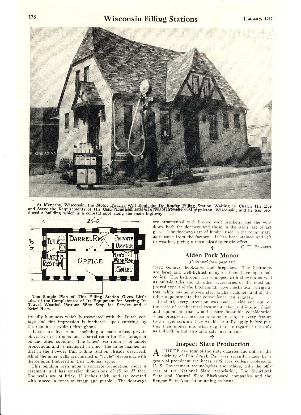 The second of these stations is the DeBaufer Filling Station at Menasha, Wisconsin. The design was done by W. H. Gmeiner, architect of Appleton, Wisconsin, for the owner, A. W. Borens, of Menasha, It has the effect of friendly hominess which is associated with the Dutch cottage and this impression is furthered, upon entering, by the roominess evident throughout.