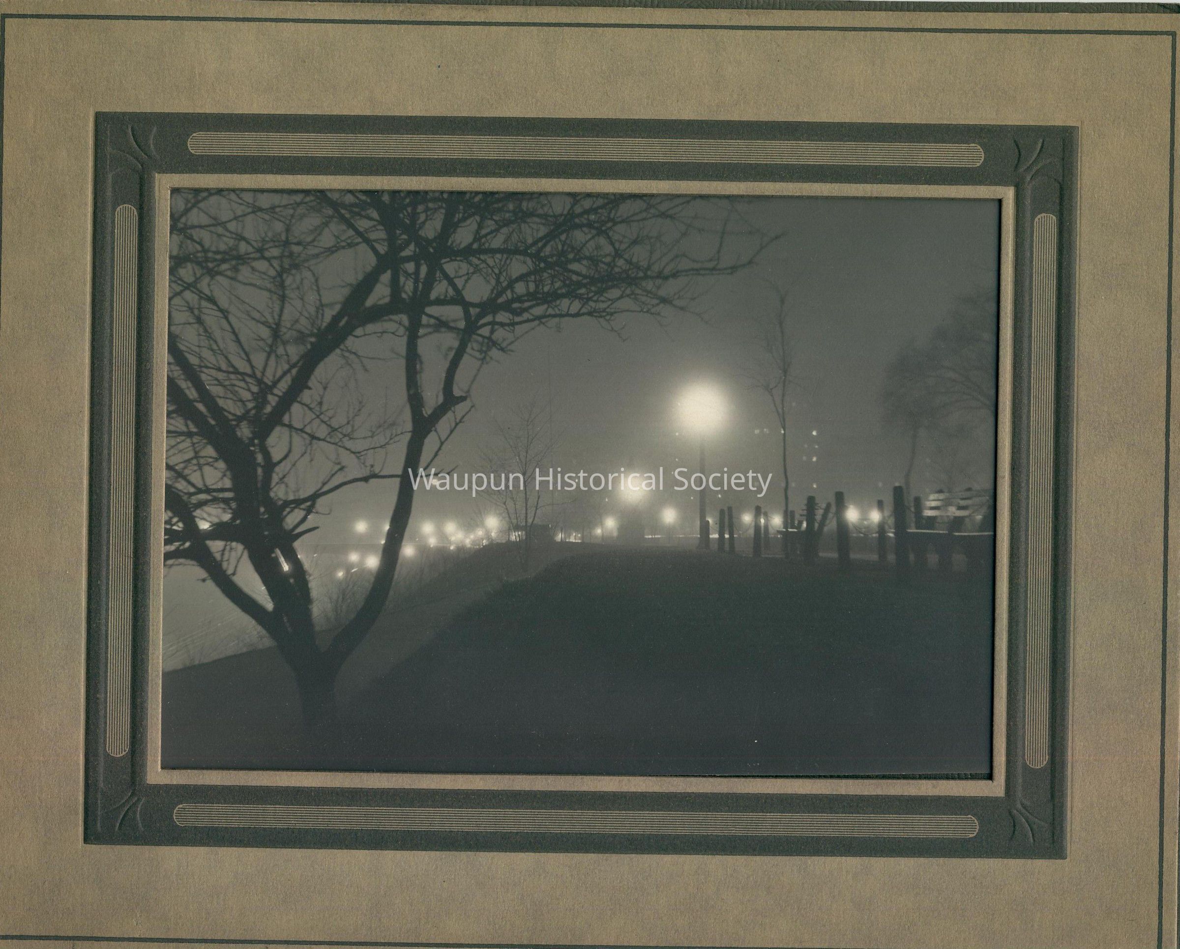 Portrait, found in an unidentified box in the Waupun Heritage Museum work room. Please contact the Waupun Heritage Museum at 22 S. Madison St. Waupun, WI 53963. Phone No. 920-324-7931. This is a picture of a park at night with the city lights behind it.Acquisition