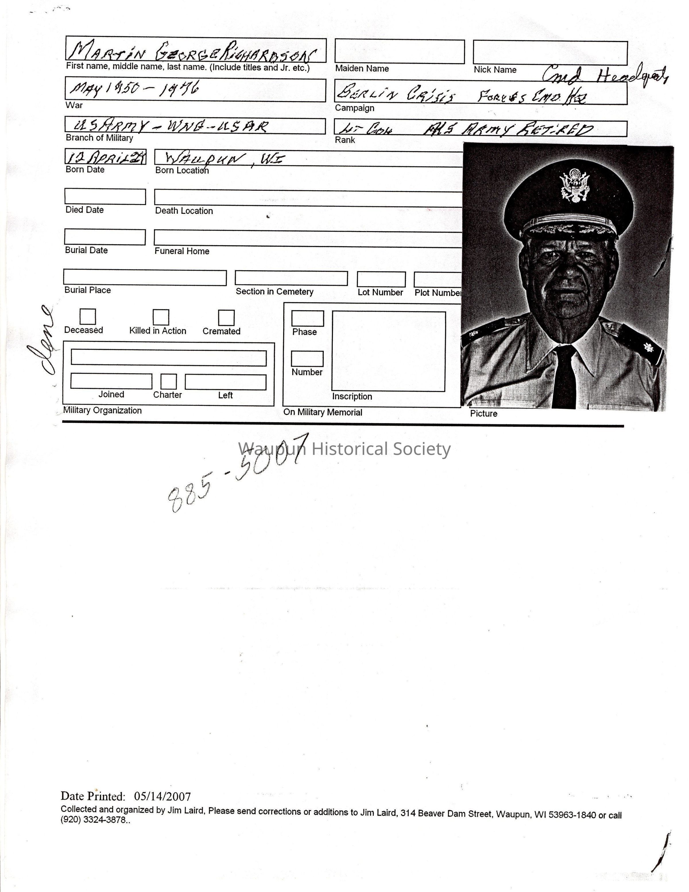 Martin George Richardson military form. This form indicates that Martin was in the war from May 1950 to 1976. He was in the U. S. Army. He was born April 12, 1929 in Waupun, WI. He worked with the Korean Crisis and is presently U. S. Army retired as a Lt. Com.Acquisition
