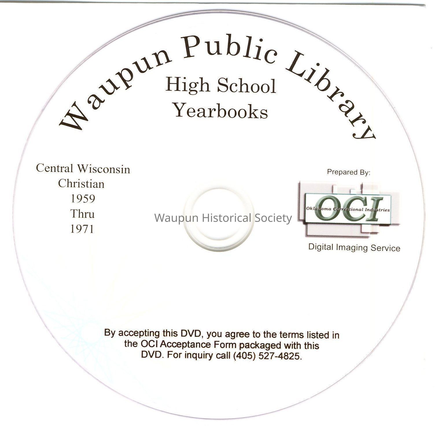 DVD of Waupun Central Wisconsin Christian School Yearbooks - 1959-1971. Made by Pam Garcia at the Waupun Public Library and donated to the Waupun Museum.Acquisition