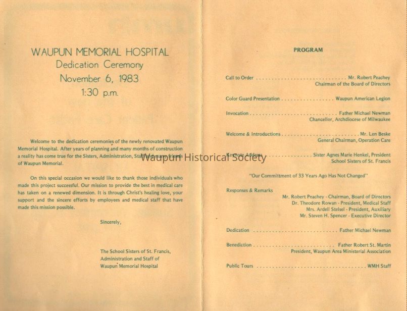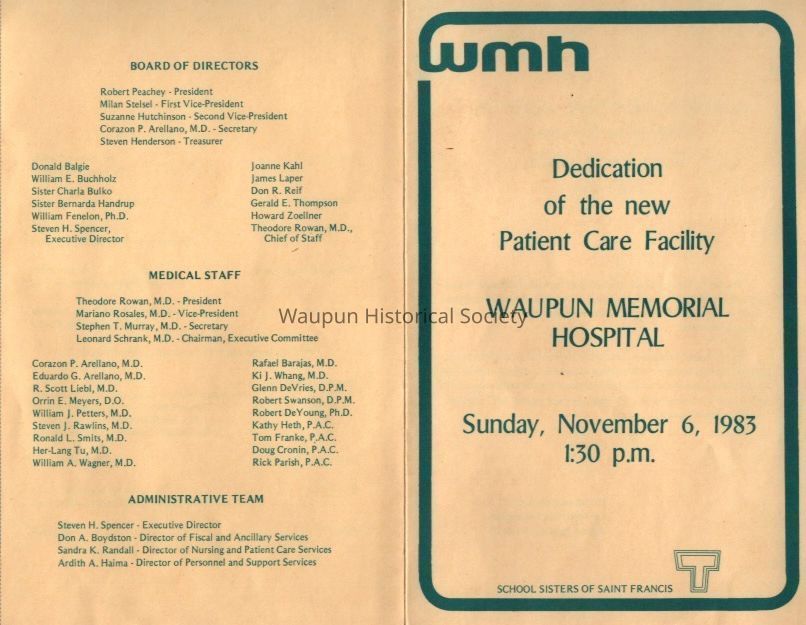 Program, Waupun Memorial Hospital Patient Care Facility Dedication, 1983Acquisition