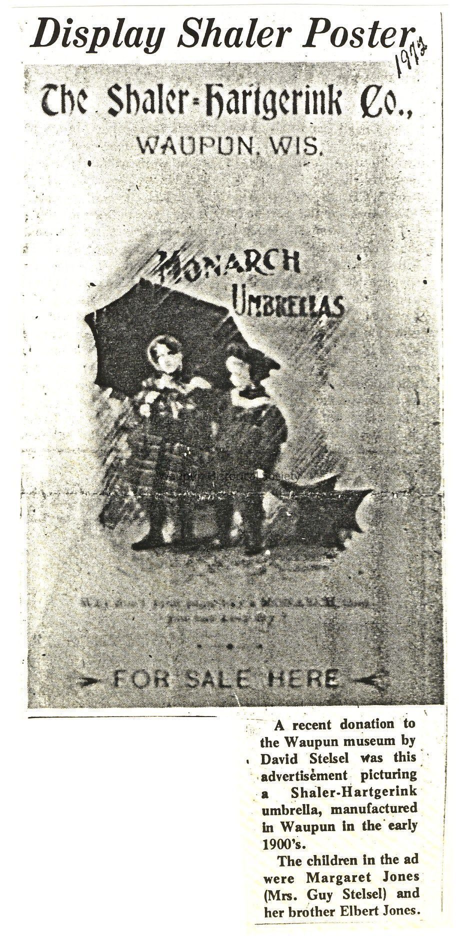 A recent donation to the Waupun museum by David Stelsel was this advertisement picturing a Shaler-Hartgerink umbrella, manufactured in Waupun in the early 1900's.