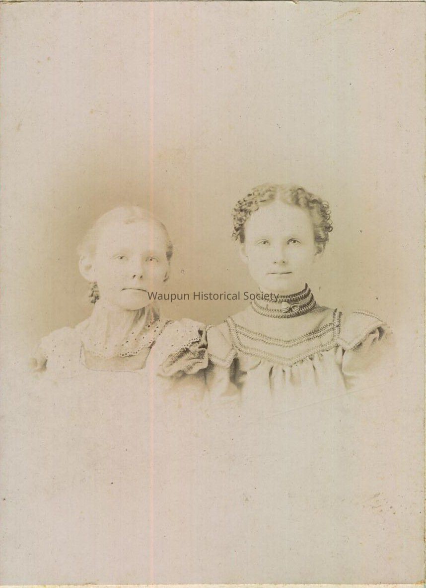 Photograph discovered in the "telephone company" file in the upstairs office file cabinet at the Waupun Heritage Museum. The information contained in the file was from Miss Lydia Weckworth, long-time telephone operator in Waupun. This photograph shows two young girls, most likely Lydia Weckworth and her younger sister, Minnie Weckworth. It is not identified on the back. Photo by Stanley Johnson, early 1900s or late 1800s.