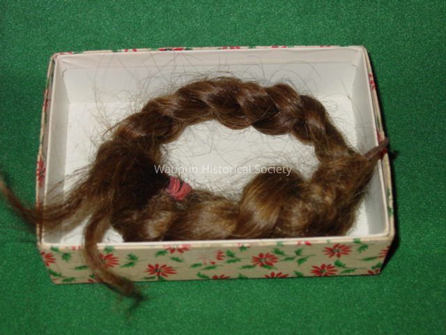 Inez Clara Wilcox, daughter of Thurston and Clara Beardsley Wilcox and granddaughter of Seymour and Lucy Newton Wilcox, founders of Waupun. She was born in 1863. This is her braided cut hair.Acquisition