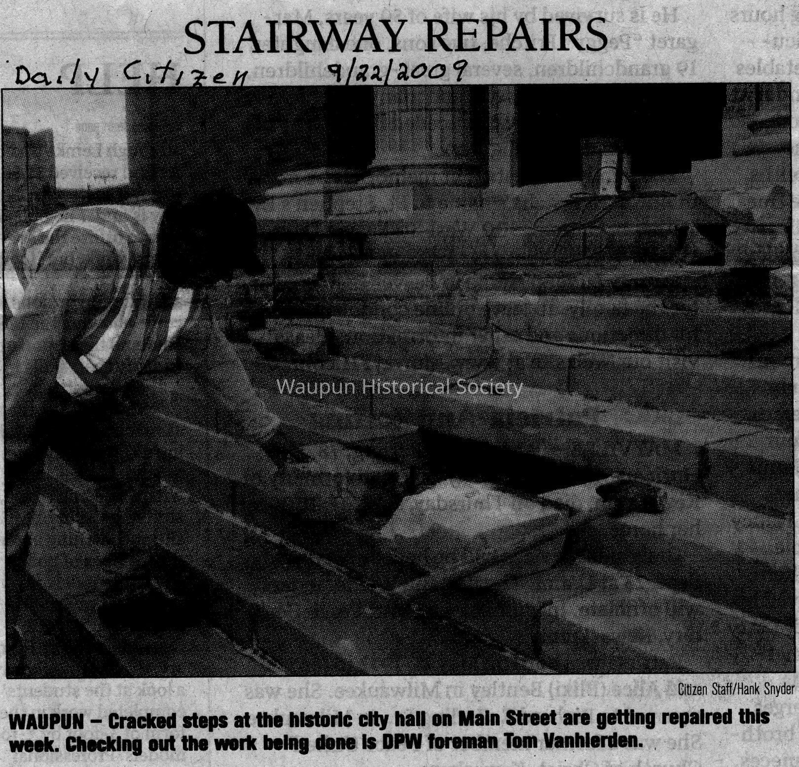 WAUPUN — Cracked steps at the historic city hall on Main Street are getting repaired this week. Checking out the work being done is DPW foreman Tom Vanhierden.