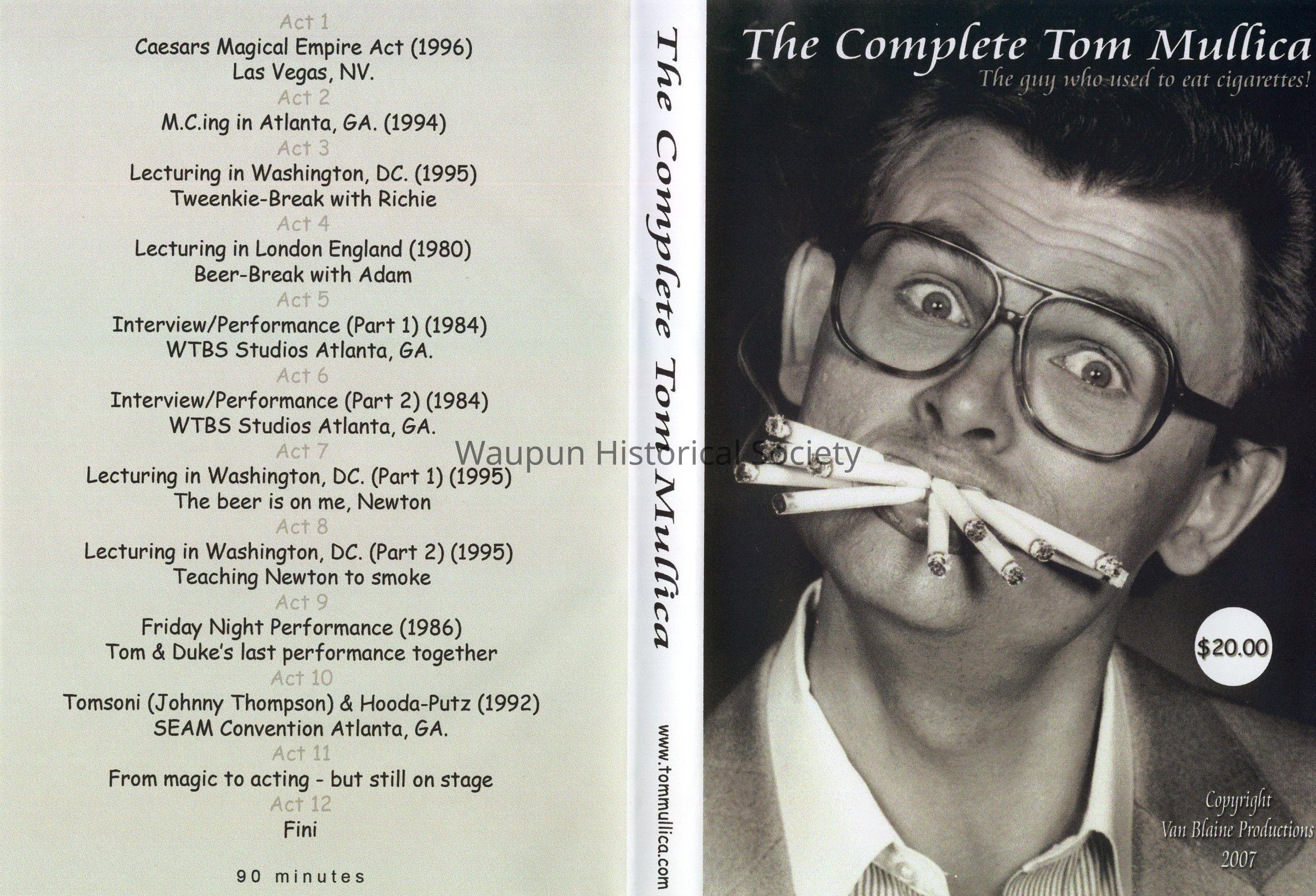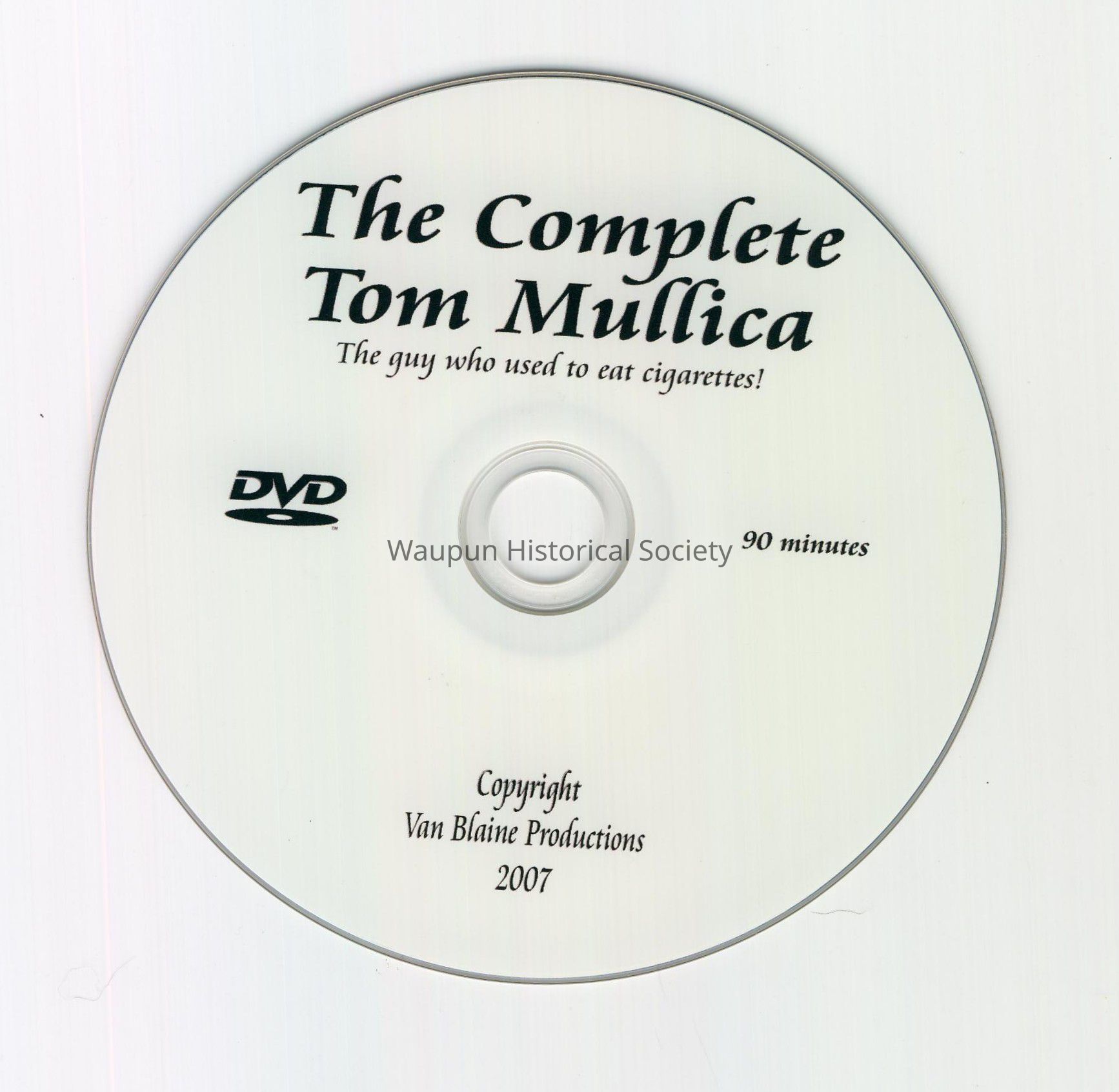 Tom Mullica DVD recording. This recording was donated to the Waupun Historical Society by actor Tom Mullica. Tom performs magic and acts as Red Skelton. He has performed in Waupun as a fund raiser for the Waupun Fire Department. The DVD is autographed by Tom Mullica. There are newspaper articles about Tom in the computer system.Acquisition