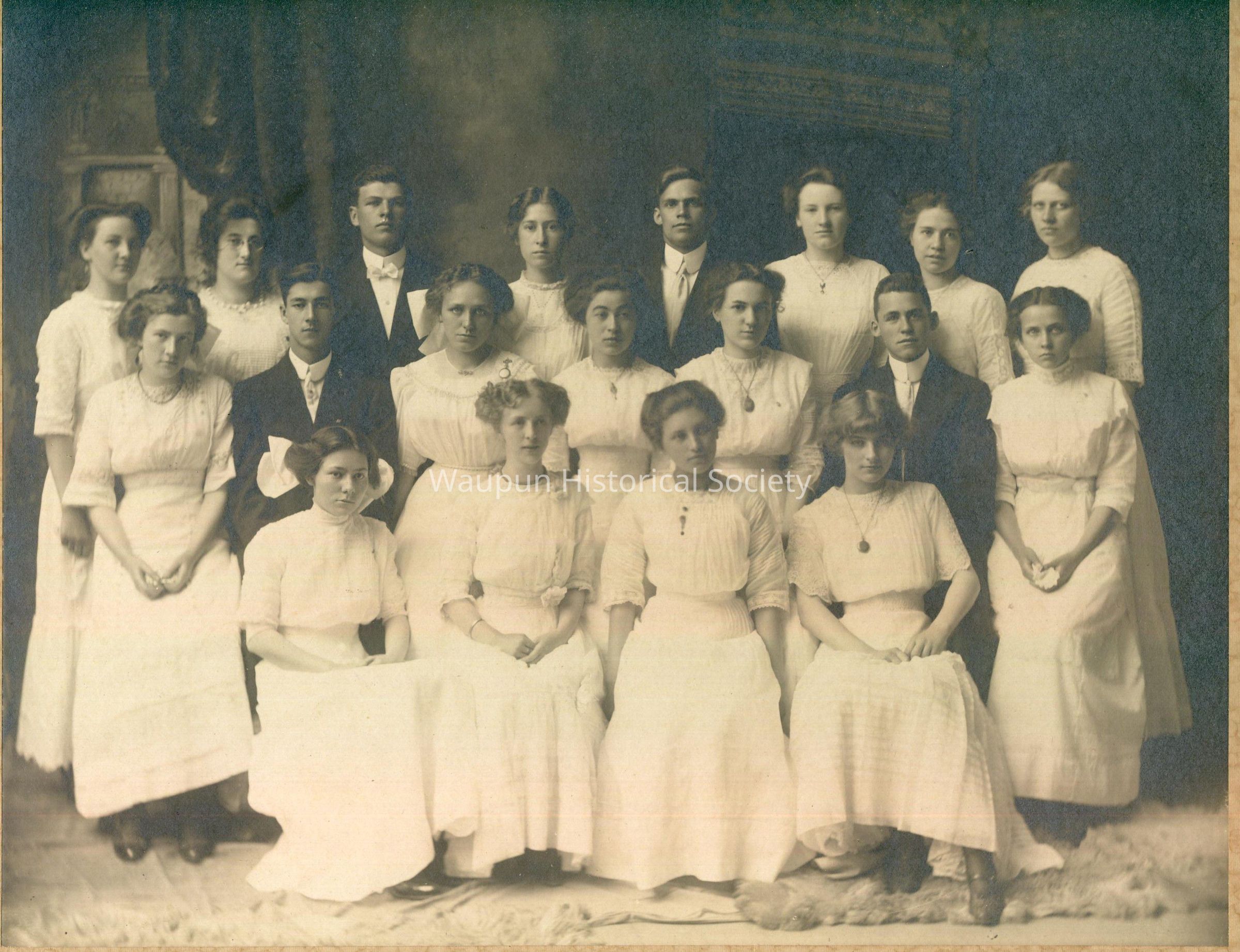 Photo found in an unidentified box in the Waupun Heritage Museum work room. Please contact the Waupun Heritage Museum at 22 S. Madison St. Waupun, WI 53963. Phone No. 920-324-7931. This is a photo of maybe a graduation class. There are 19 young men and women in the photo. On the back of the photo is written some names, which are not really in order of the people in the photo.