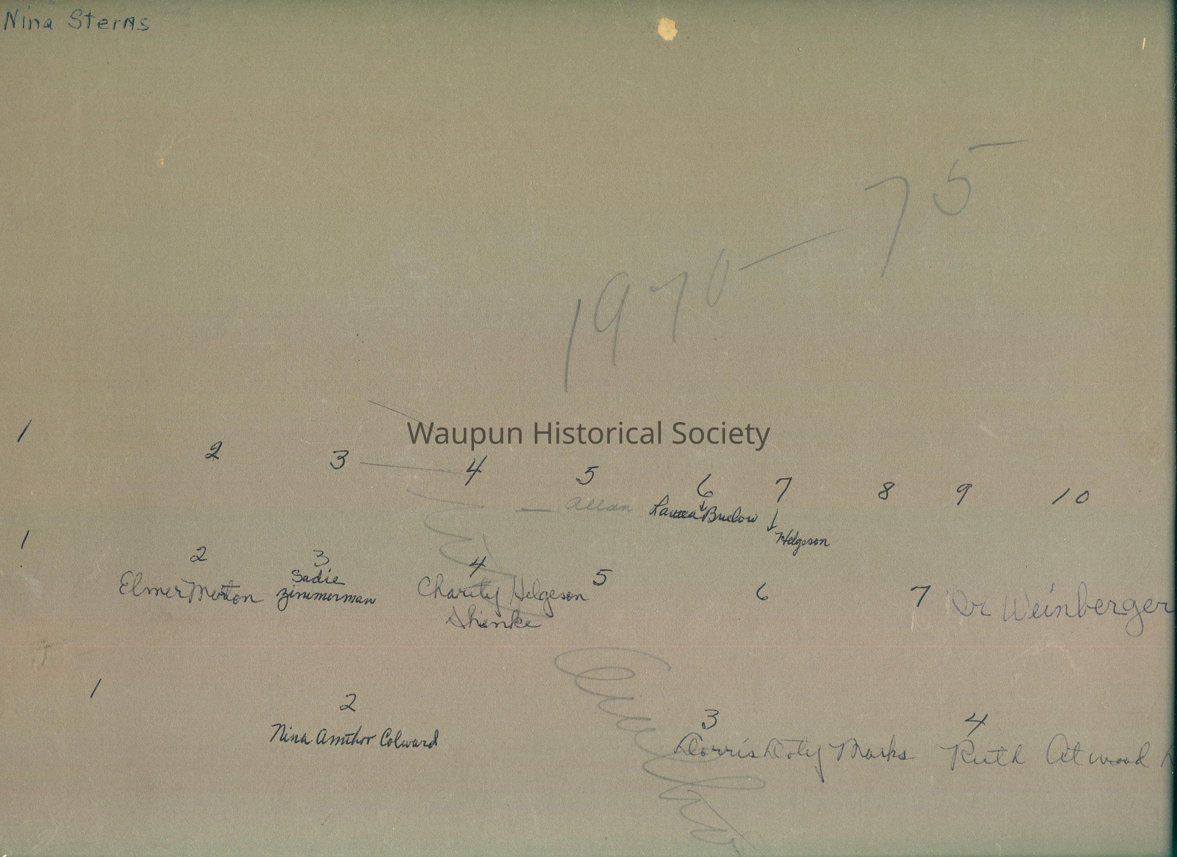 The names that are written on the back are: Allan, Laurea Buelow, Helgeson, Elmer Morton, Sadie Zimmerman, Charity Helgeson Shinke, Dr. Weinberger, Nina Amthor Colward, Dorris Doty Marks, Ruth Atwood Davison.Acquisition