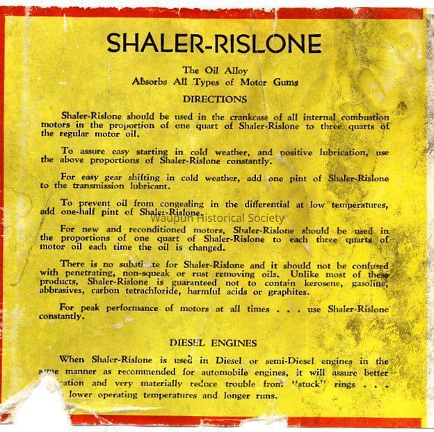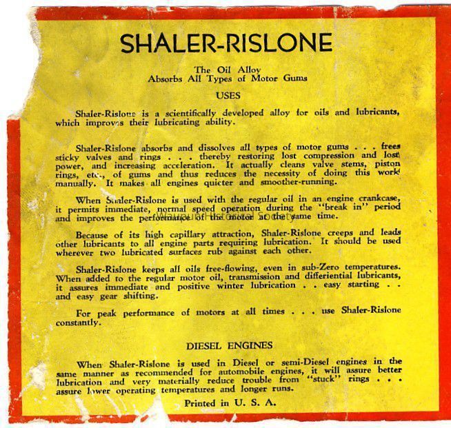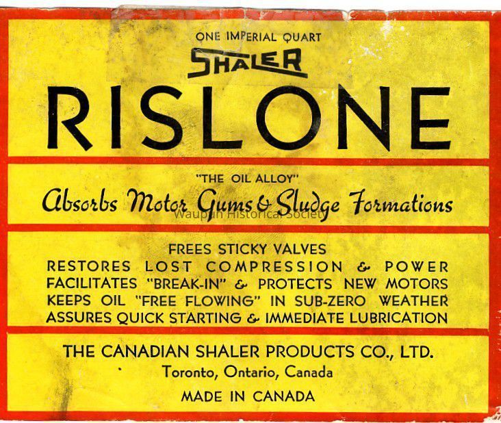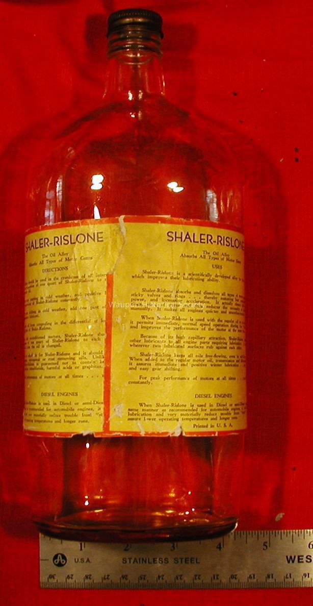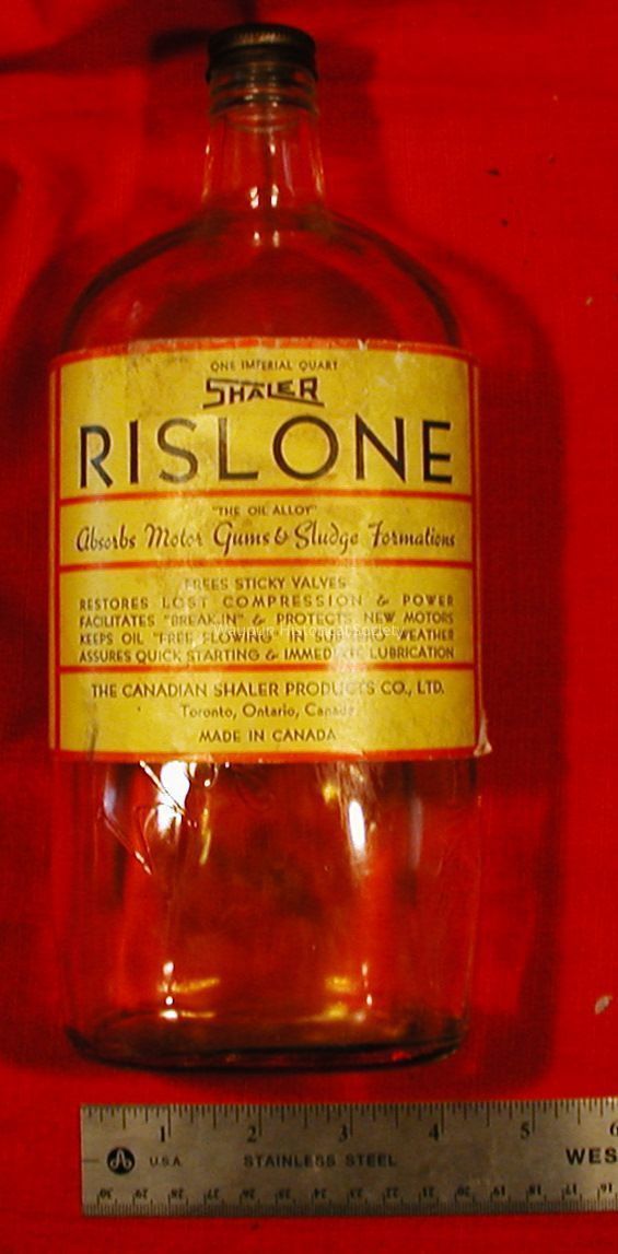 Rislone bottle. Rislone was a product made by the Shaler National Rivet company. The ebay seller indicated that is bottle was from WWI and that the company had to reuse bottles. There is a W & J Gjilley embrosing on the bottle under the label. The seller indicated that because of the war companies had to use any container that was available. Notice also that thesize is one imperial quart and that the product was made the "The Canadian Shaler Products Co., LTD.Acquisition