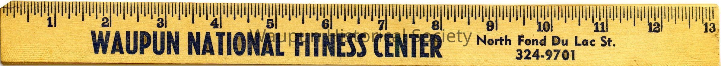 1 13" ruler with advertising for the Waupun National Fitness Center on North Fond du Lac Street. It is made of wood.Acquisition