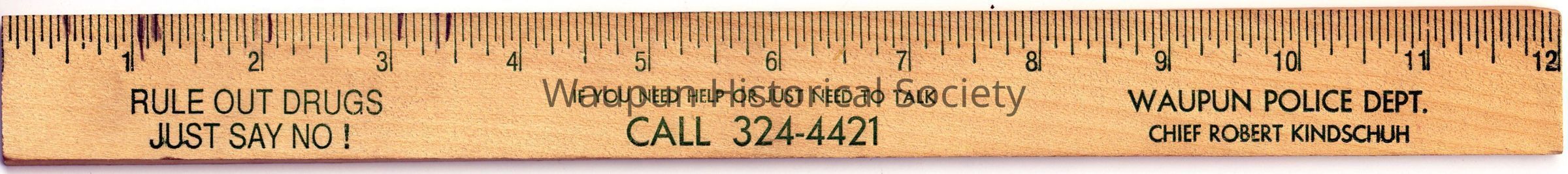 1 12" ruler given out by the Waupun Police Department. It indicates "Rule out drugs, just say no!" At the time this ruler was given out Robert Kindschuh was Police Chief.Acquisition