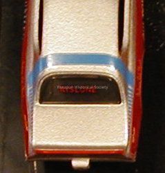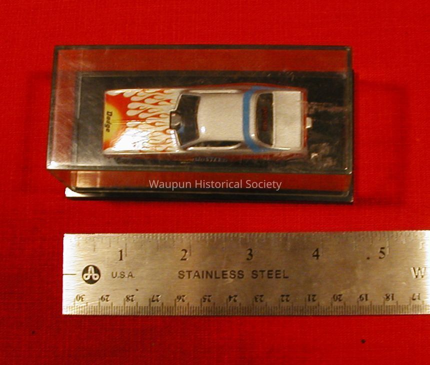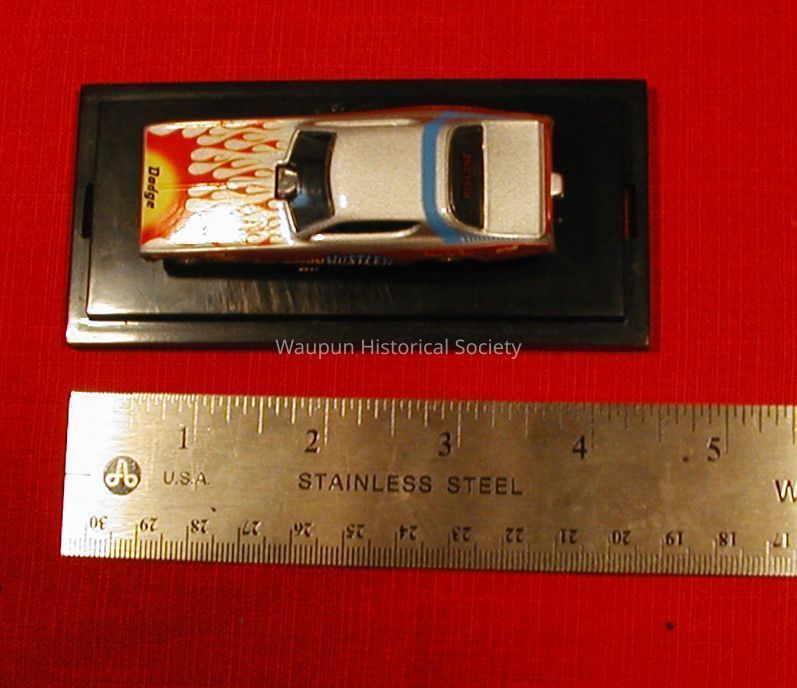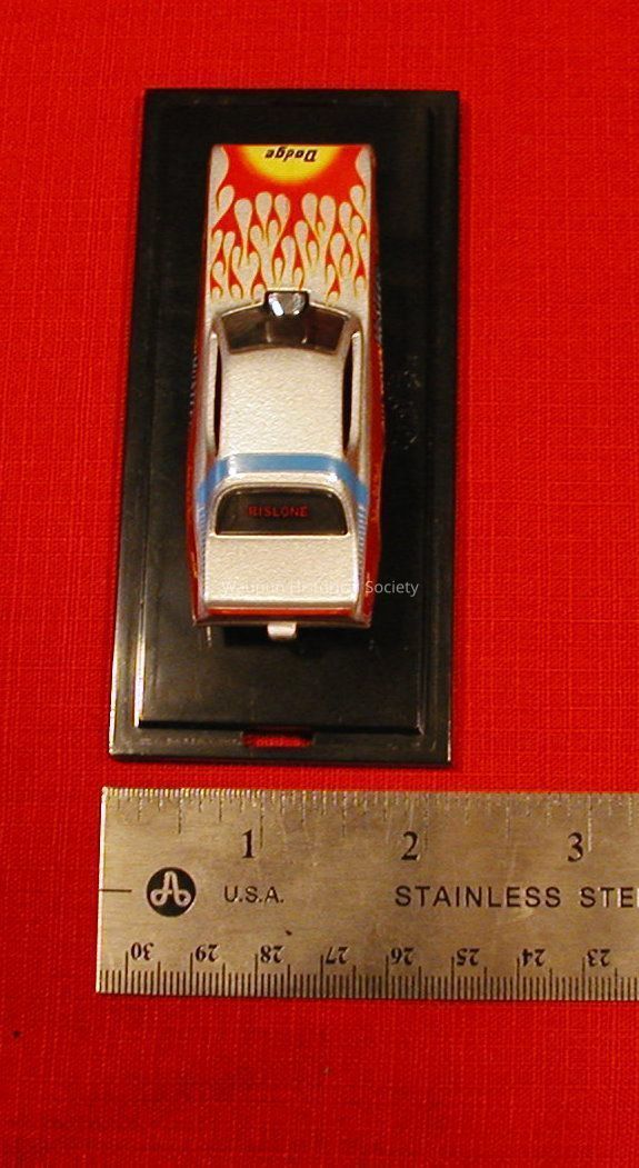Mattel auto. Toy car made by Mattel. On the back window is written "Rislone." Rislone was a product made by the Shaler Corporation of Waupun. The holder of the car is 4 1/2 " X 2 1/2 ".Acquisition