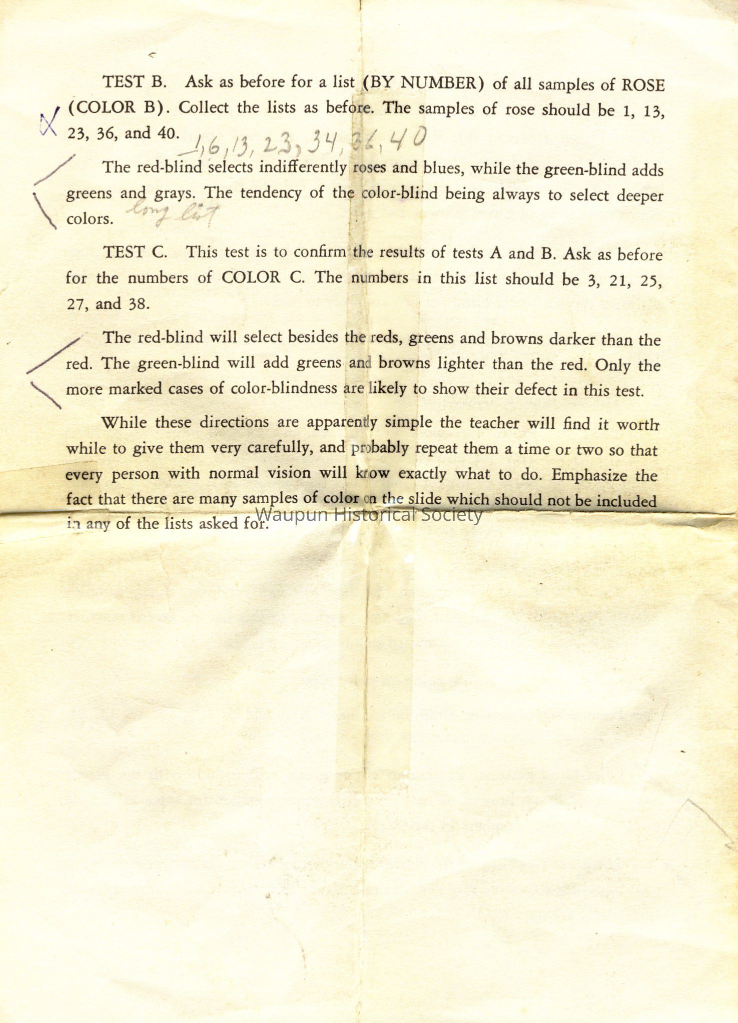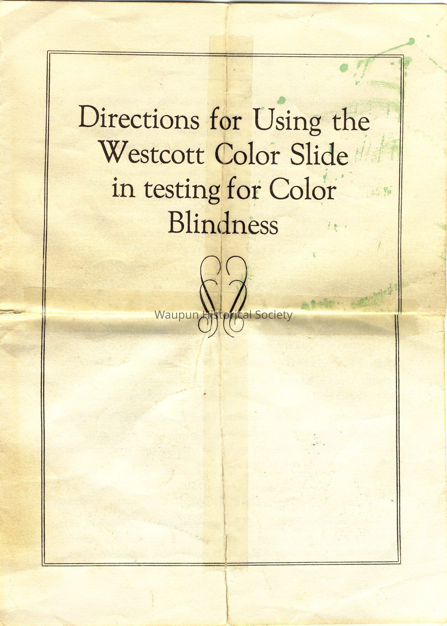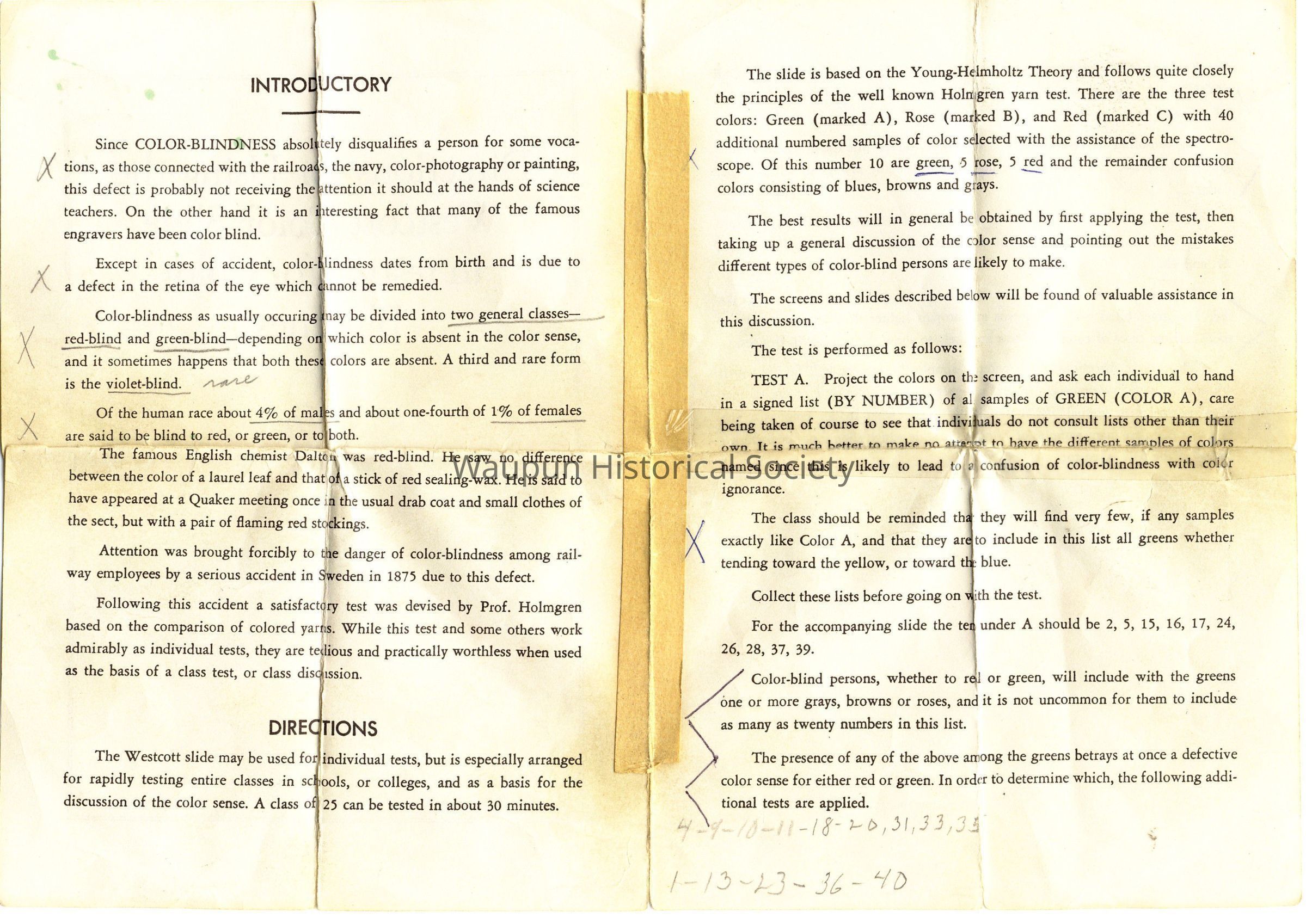 Original directions enclosed with the glass slides used with the projector, manufactured by Keystone View Co. located in Meadville Pa.. Later bought out by Bausch and Lomb. Model number 103673. It was used to determine levels of color blindness in school students. Presented to the museum by the Waupun School District on June 13, 2007. At this time there's not date of manufacturing or name of inventor.Acquisition