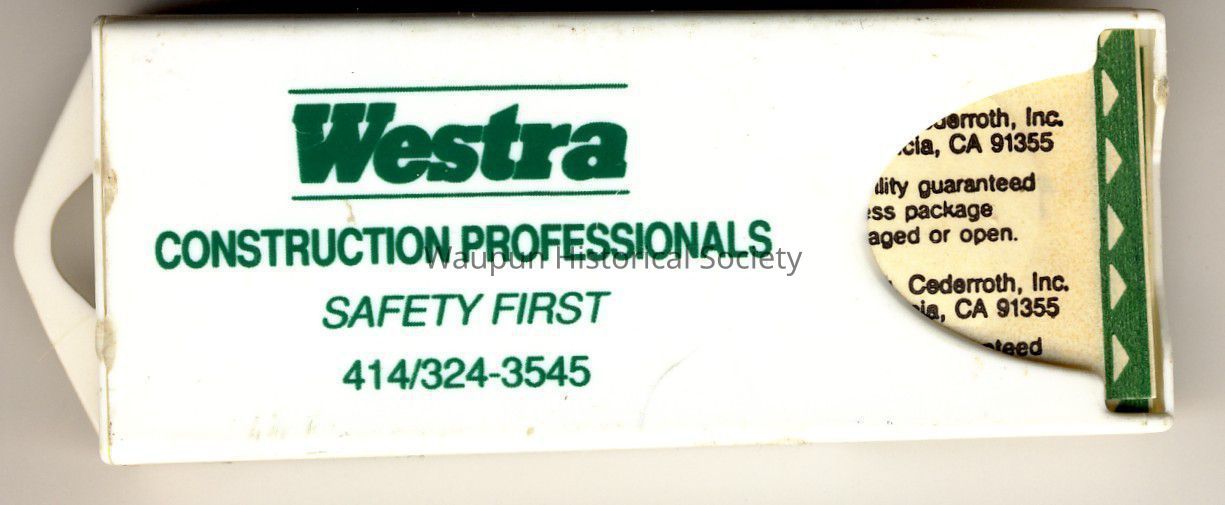 Band Aid dispenser with Westra advertising. Westra Construction Professionals Safety First 414/324-3545. Westra is no longer in business. Notice that the area code at the time this was given out was 414, presently it is 920. It is 1 1/2" X 3 3/4" X 1/2"Acquisition