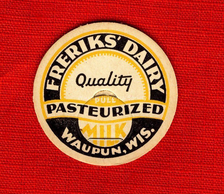 Milk, Bottle Cap, Dairy, Freriks Dairy. Milk bottle cap advertising Freriks Dairy. It indicates Quality, Pasterurized and Waupun, Wis. The 1938 City Directory indicates that Freiks Dairy was at 16 Commercial Street. Right below it indicates Richard Feriks (Alice) dairyman, h 557 E. Jefferson, Nancy Ellen 4.Acquisition