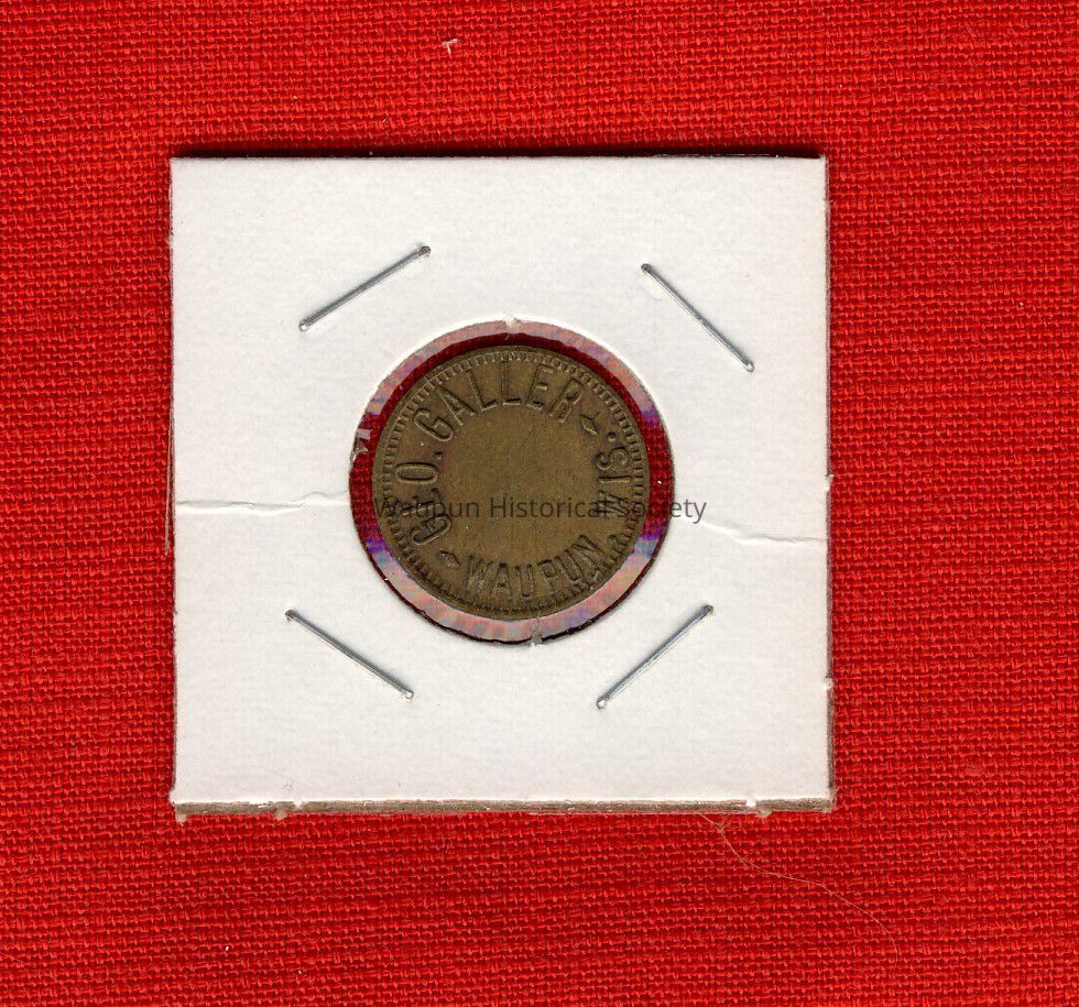 Geo. Galler bar token. Bars would give these in change and they could be used the next time the patron was in the bar. This token was given by George Galler. The 1960 Waupun City Directory list "Galler, George (Dorothy), mgr. Gysbers Food Store, h 200 W. Main." The same Waupun City Directory lists "Gysbers Super Market, Inc., George Gysbers, pres., 401 E. Main." The token was worth 5 cents.Acquisition