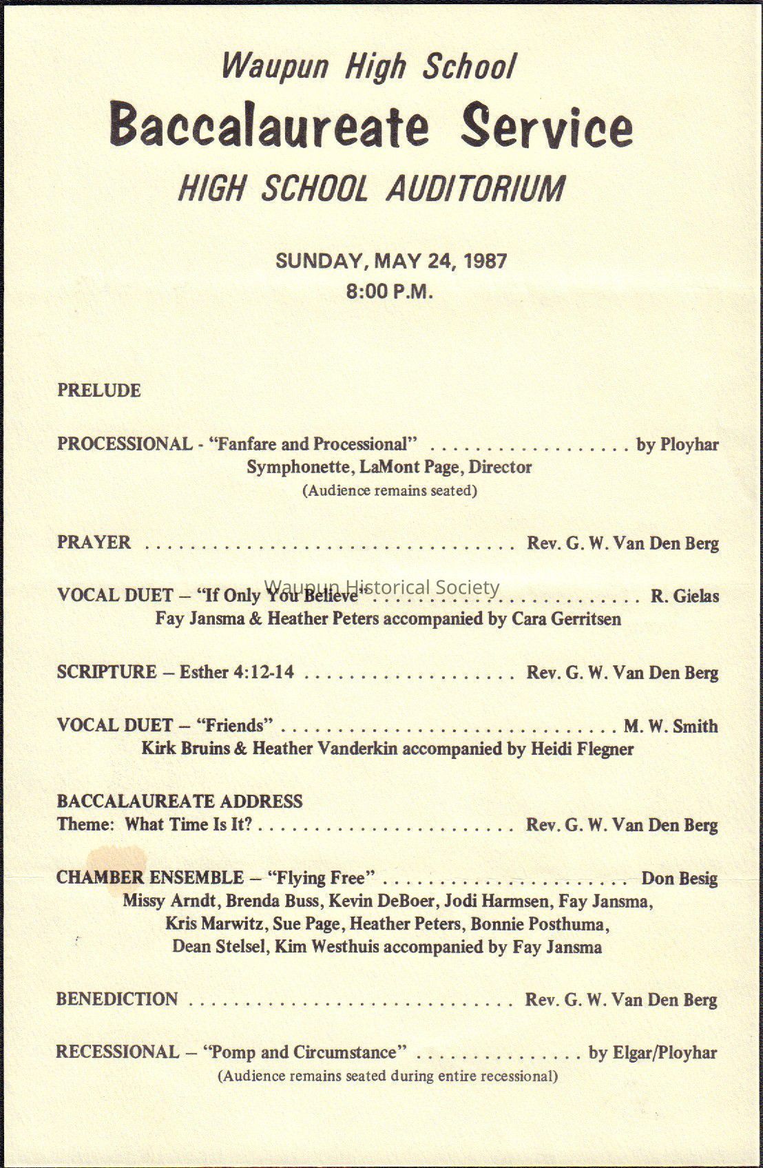 Waupun High School "Baccalaureate Service" (May 24 1987)Acquisition