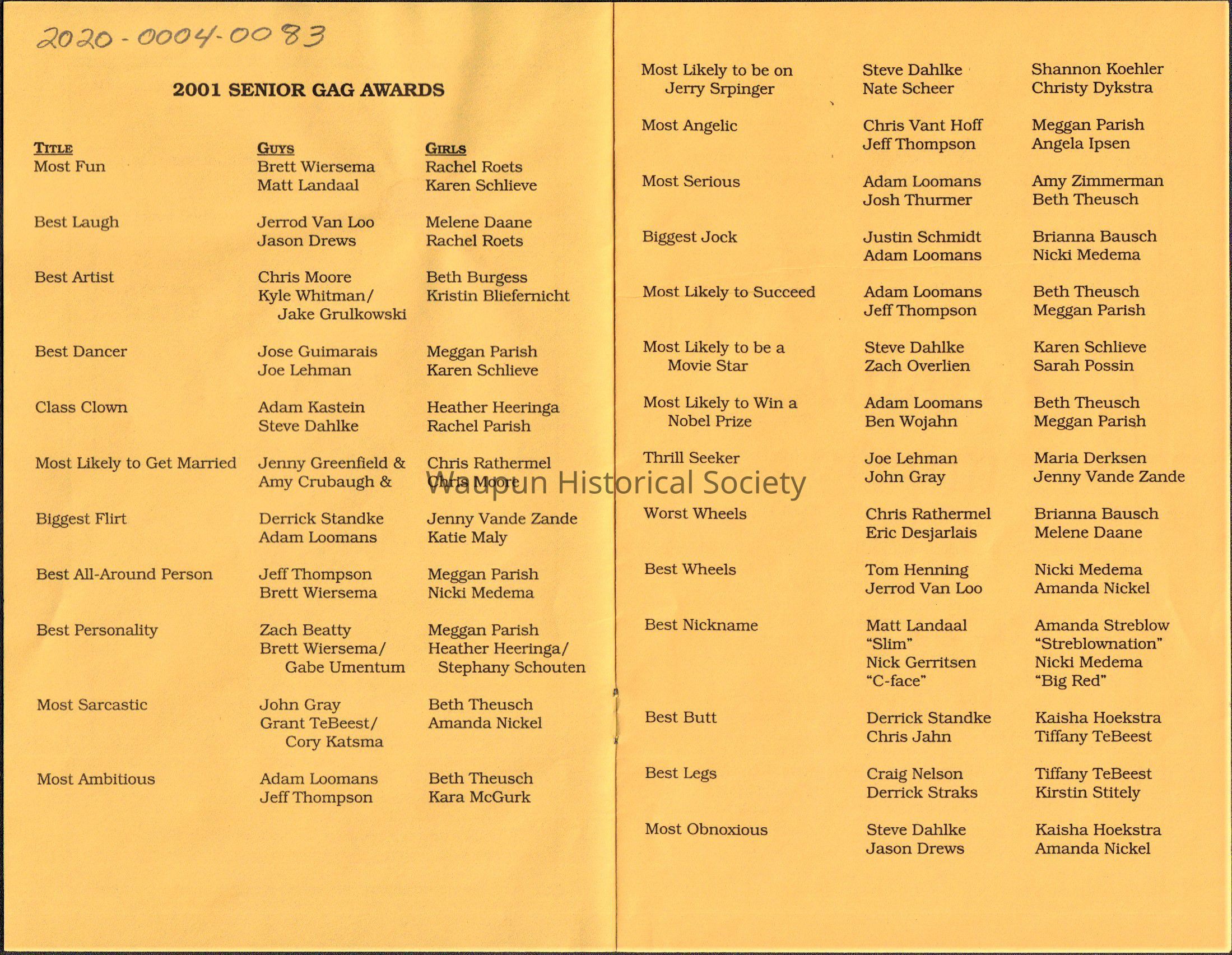 Waupun High School - "Senior Gag Wards" Class of (2001)Acquisition