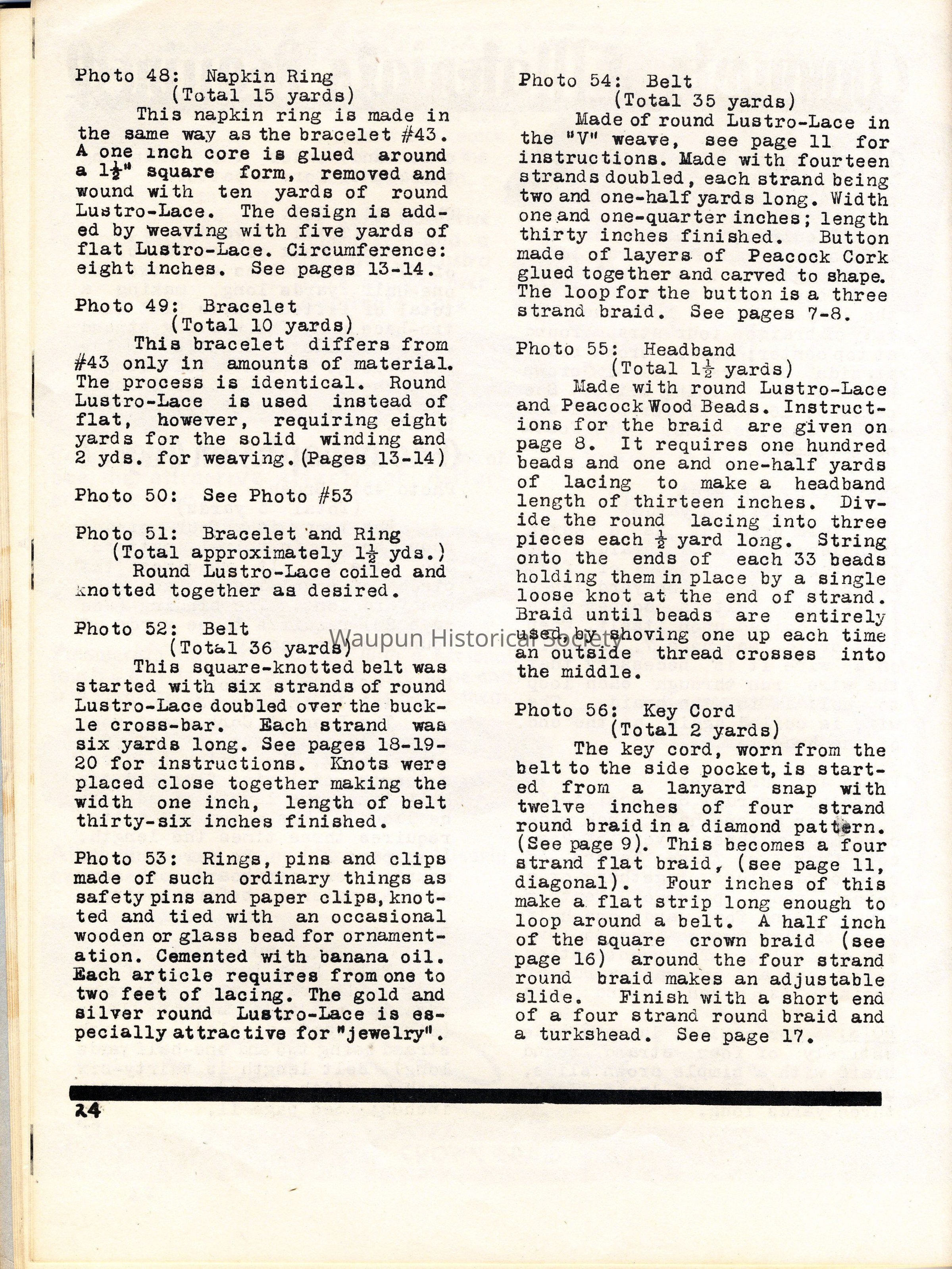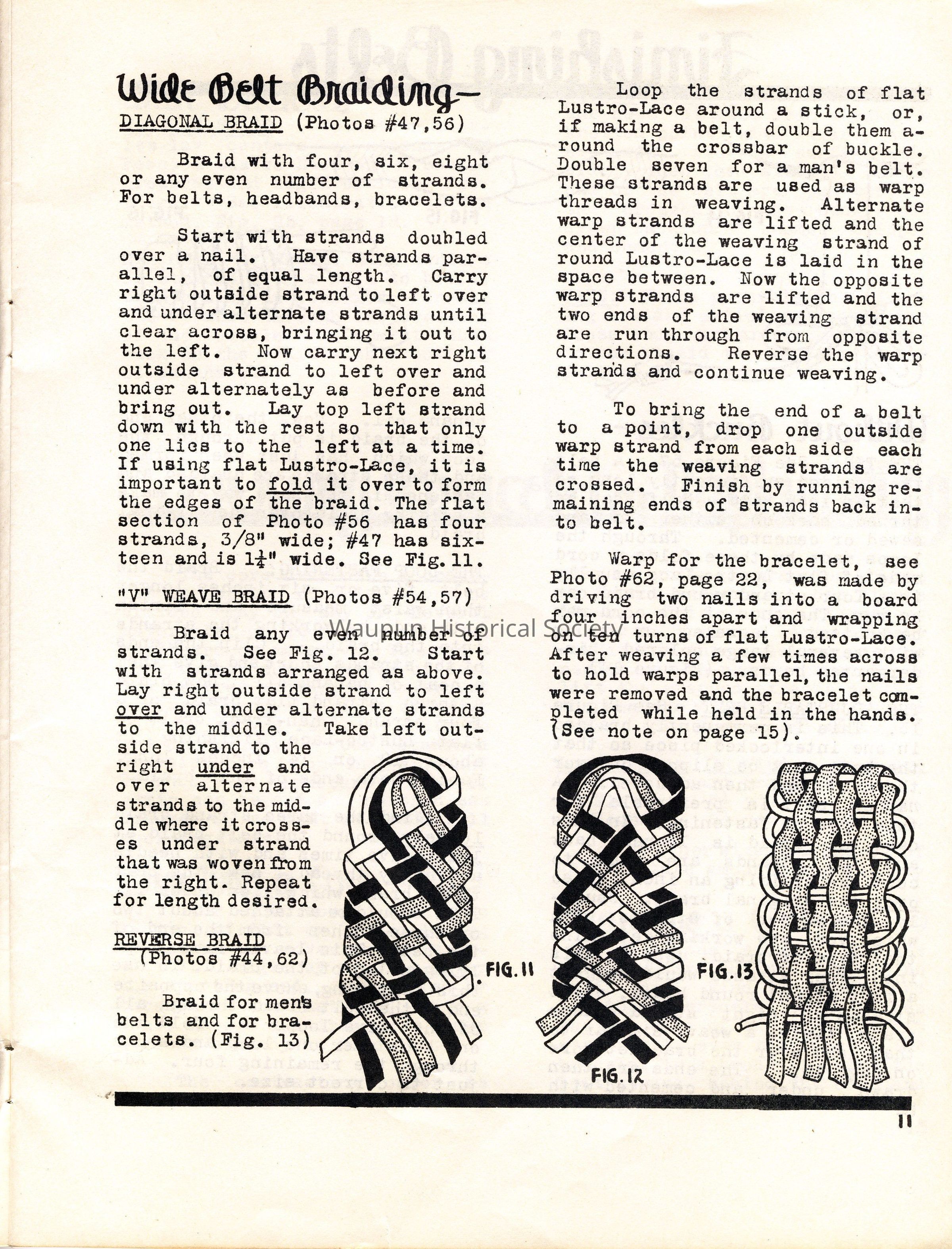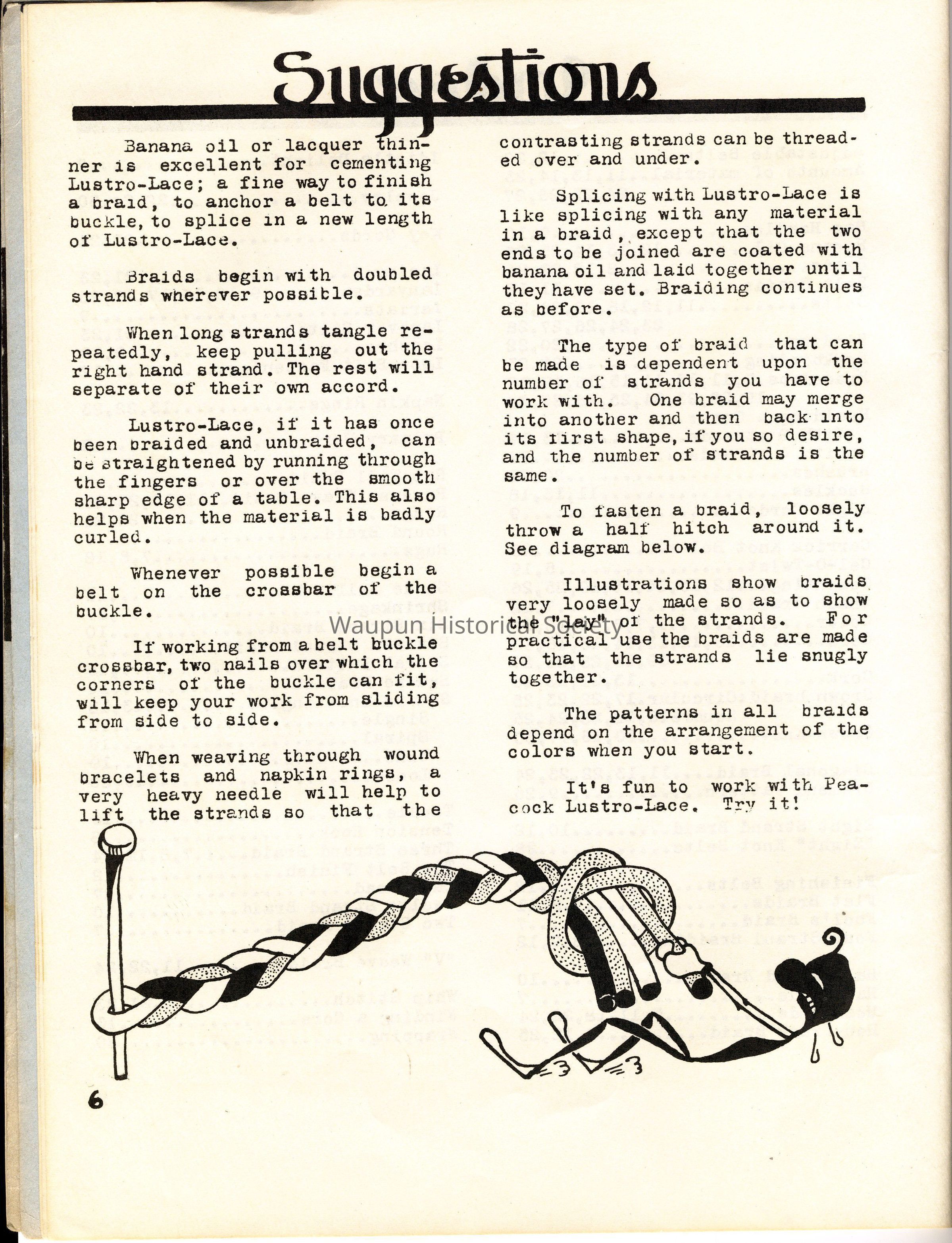 Booklet published by Handcrafters of Waupun. This is an instruction booklet for making belts and bracelets or napkin rings. It tells how to braid, knot, bind and lace. Has photos. The book has not been OCRed. When published there was a 50 cents charge.Acquisition