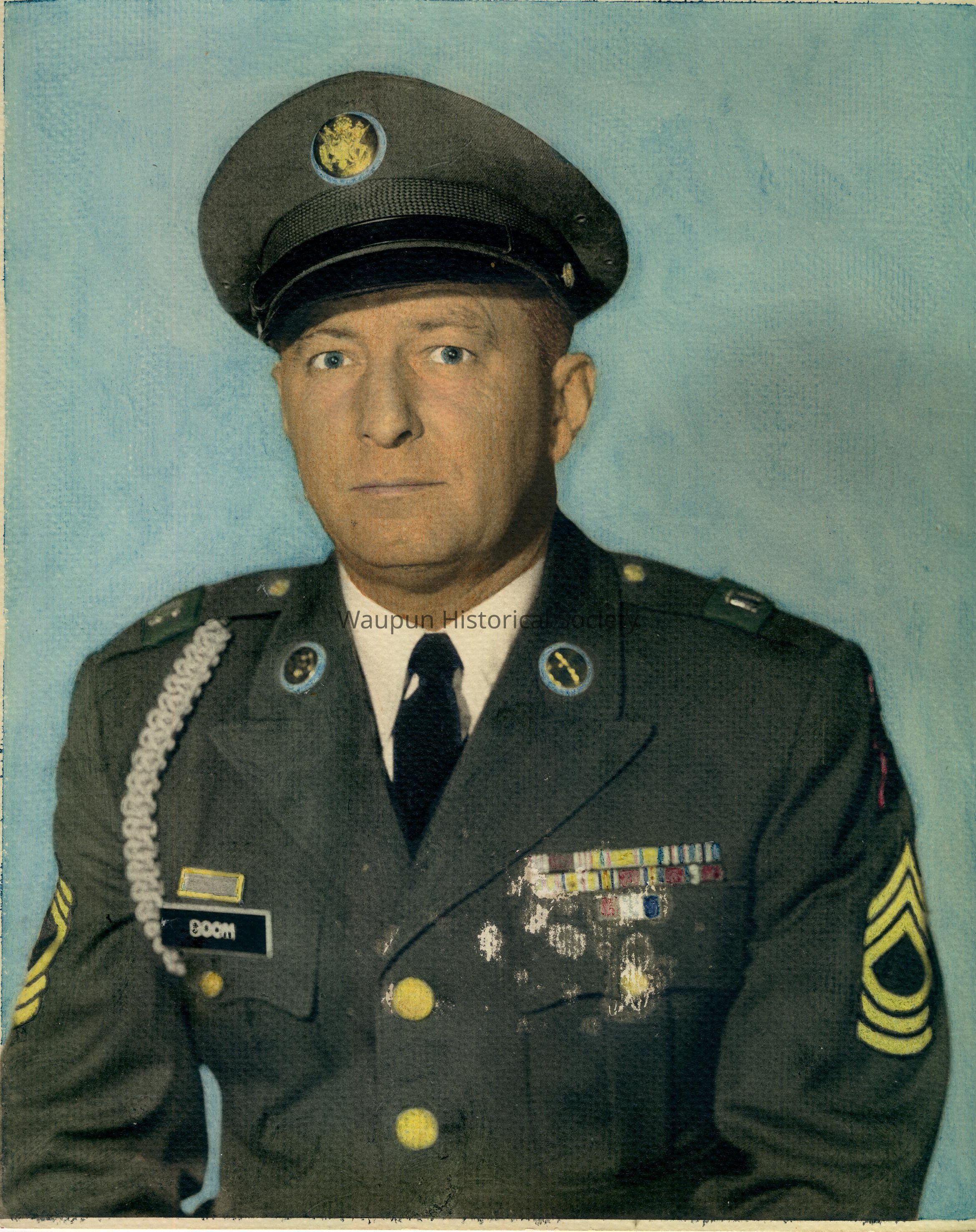 A colored photograph of Delwin Merril Boom in his military uniform. The photo was loaned from Mrs. Joy Boom and returned to her after assesstion.Acquisition