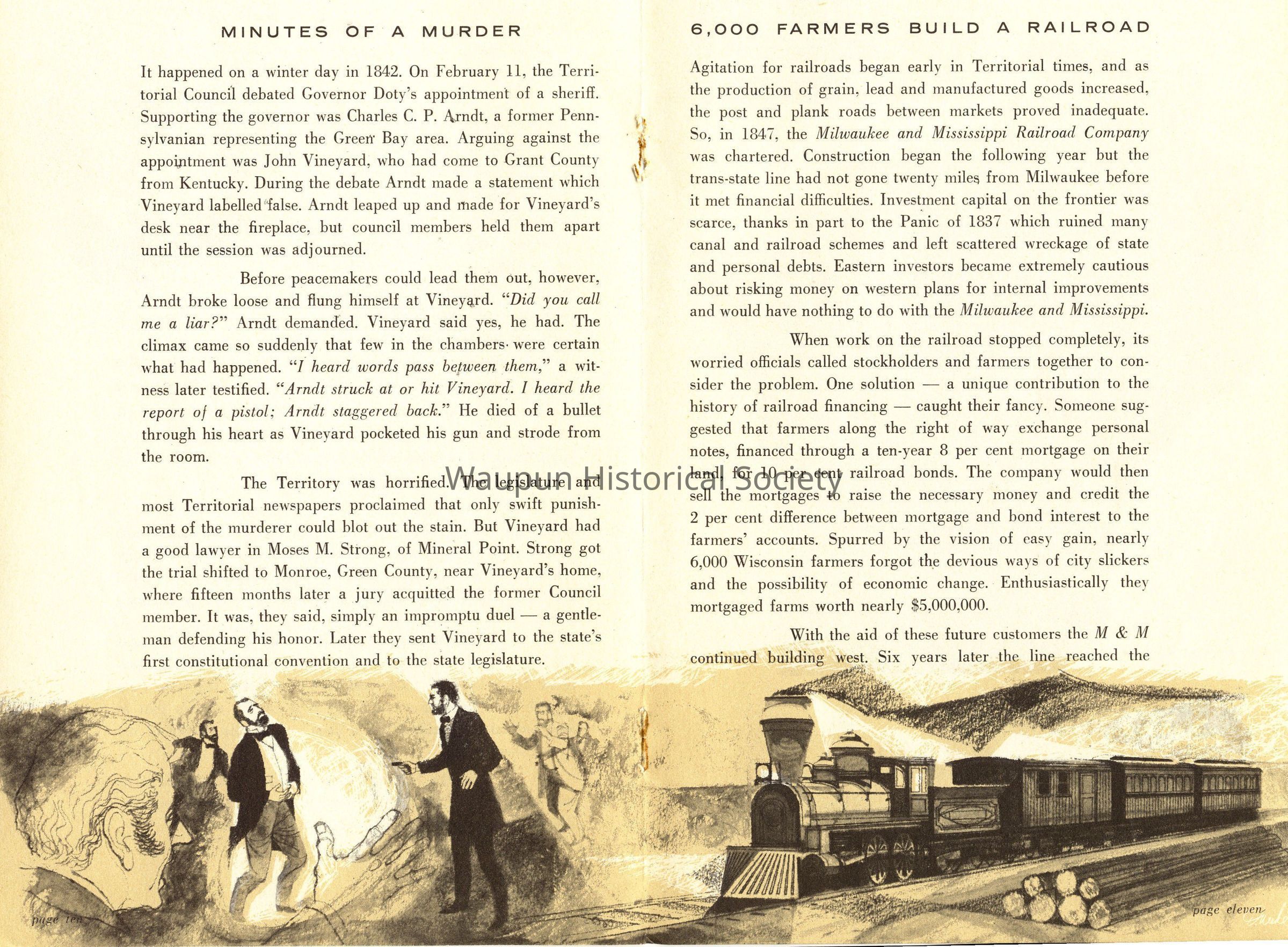 When work on the railroad stopped completely, its worried officials called stockholders and farmers together to consider the problem. One solution - a unique contribution to the history of railroad financing - caught their fancy. Someone suggested that farmers along the right of way exchange personal notes, financed through a ten-year 8 per cent mortgage on their land, for 10 per cent railroad bonds. The company would then sell the mortgages to raise the necessary money and credit the 2 per cent difference between mortgage and bond interest to the farmers' accounts. Spurred by the vision of easy gain, nearly 6,000 Wisconsin farmers forgot the devious ways of city slickers and the possibility of economic change. Enthusiastically the mortgaged farms worth nearly $5.000.000.