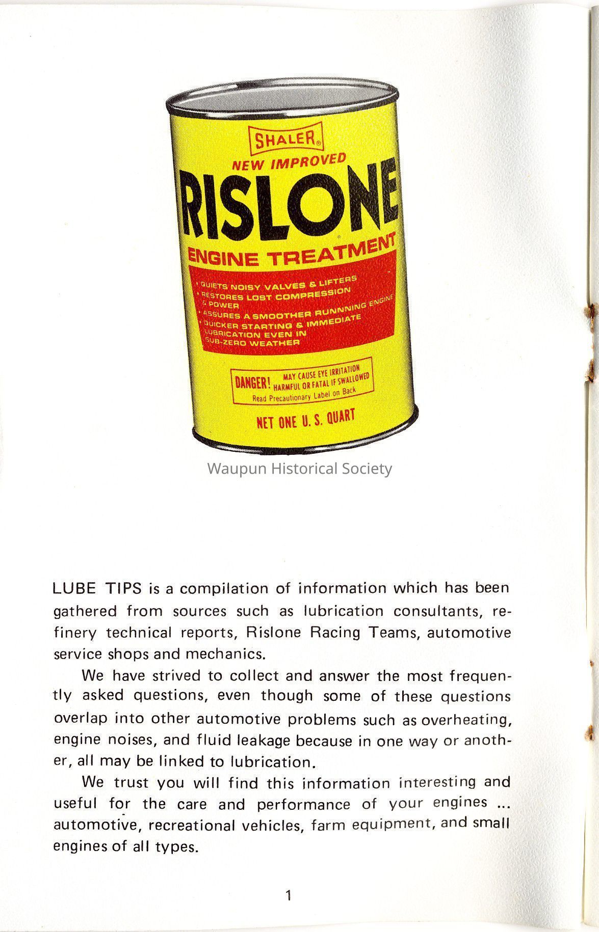 Lube tips by Rislone. A small booklet telling about Shaler Rislone products. The booklet is 4" X 6".
