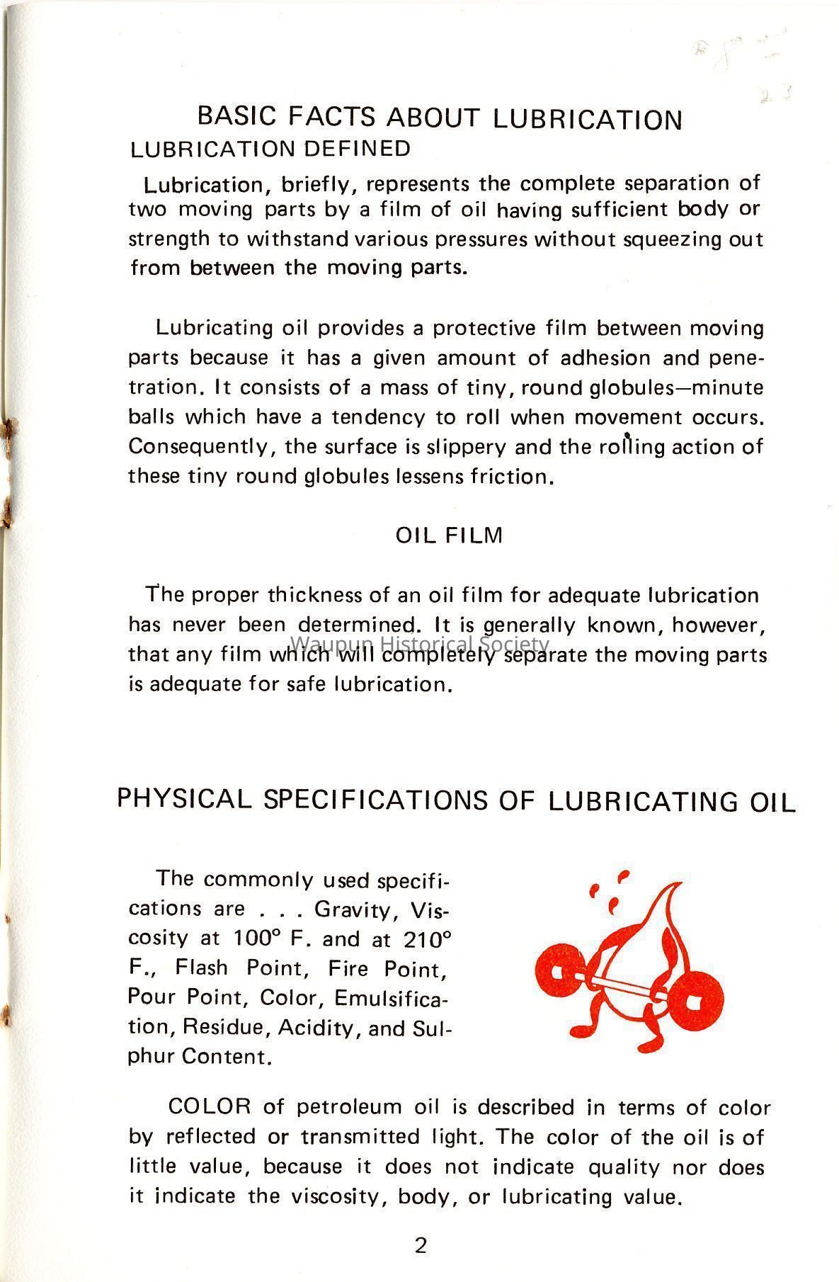 Lubrication, briefly, represents the complete separation of two moving parts by a film of oil having sufficient body or strength to withstand various pressures without squeezing out from between the moving parts.