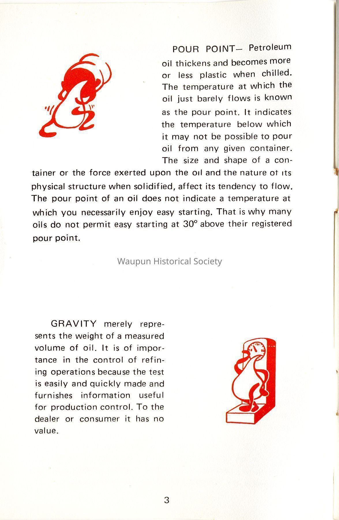 POUR POINT - Petroleum oil thickens and becomes more or less plastic when chilled. The temperature at which the oil just barely flows is known as the pour point. It indicates the temperature below which it may not be possible to pour oil from any given container. The size and shape of a container or the force exerted upon the oil and the nature of its physical structure when solidified, affect its tendency to flow. The pour point of an oil does not indicate a temperature at which you necessarily enjoy easy starting. That is why many oils do not permit easy starting at 30° above their registered pour point.