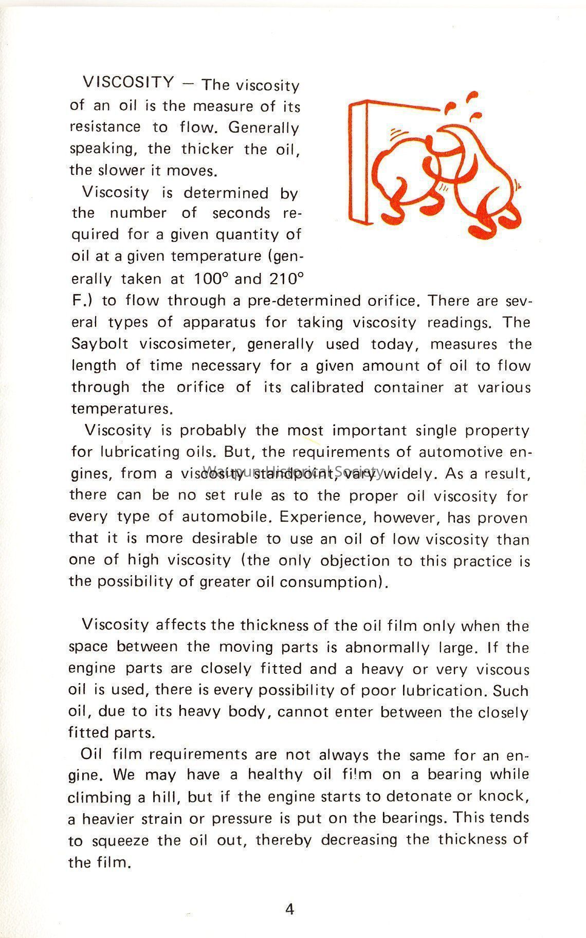 Viscosity is probably the most important single property for lubricating oils. But, the requirements of automotive engines, from a viscosity standpoint, vary widely. As a result, there can be no set rule as to the proper oil viscosity for every type of automobile. Experience, however, has proven that it is more desirable to use an oil of low viscosity than one of high viscosity (the only objection to this practice is the possibility of greater oil consumption).