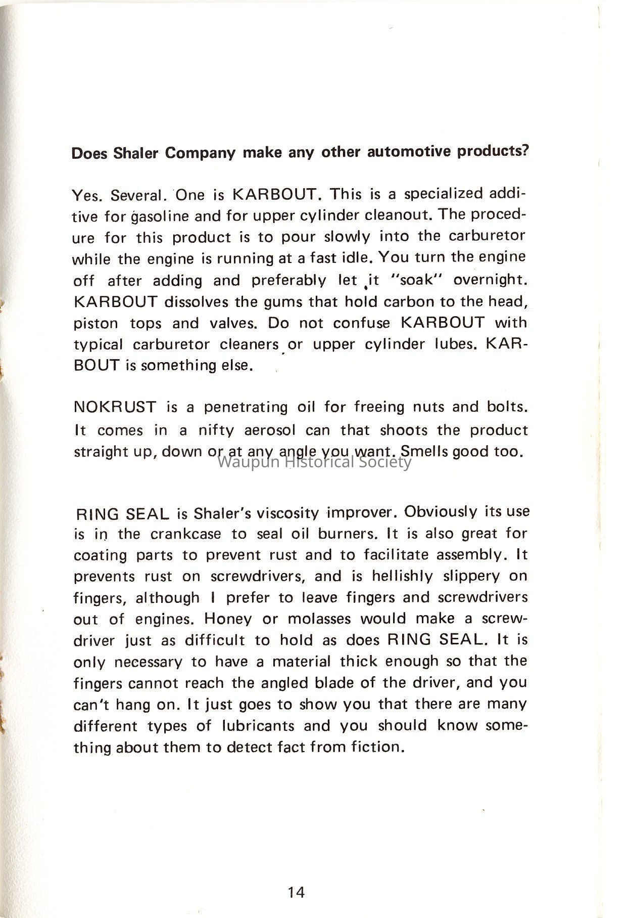 RING SEAL is Shaler's viscosity improver. Obviously its use is in the crankcase to seal oil burners. It is also great for coating parts to prevent rust and to facilitate assembly. It prevents rust on screwdrivers, and is hellishly slippery on fingers, although I prefer to leave fingers and screwdrivers out of engines. Honey or molasses would make a screwdriver just as difficult to hold as does RING SEAL. It is only necessary to have a material thick enough so that the fingers cannot reach the angled blade of the driver, and you can't hang on. It just goes to show you that there are many different types of lubricants and you should know something about them to detect fact from fiction.