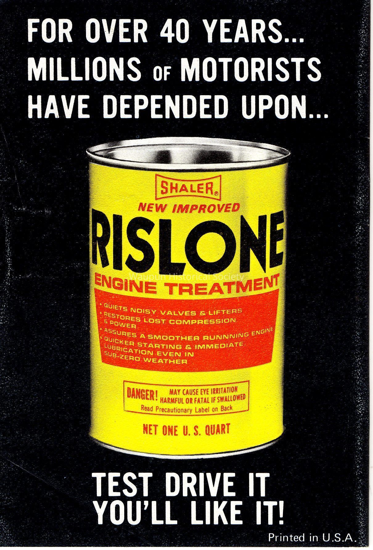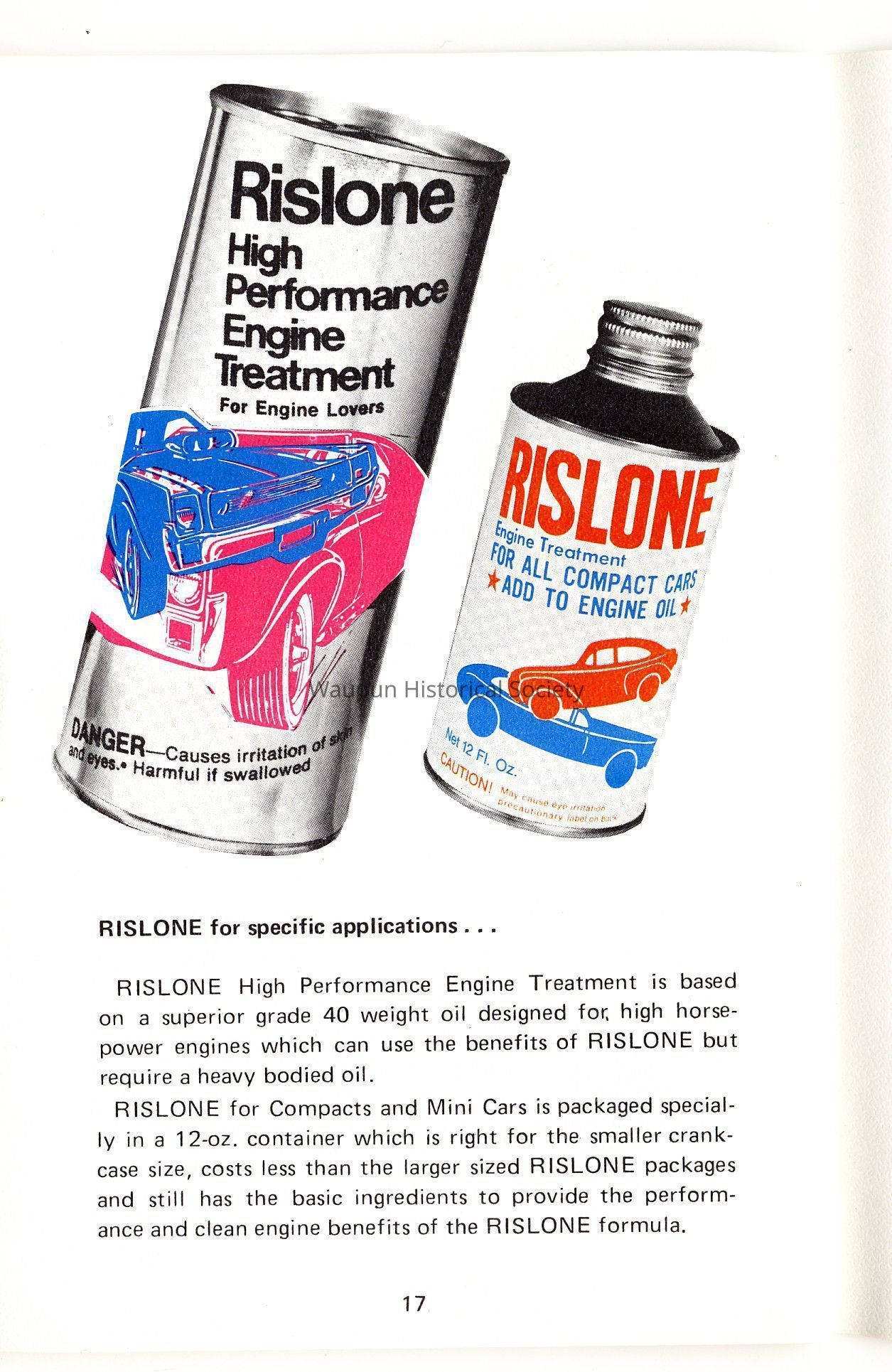 RISLONE treats your engine not the oil. It helps remove engine gums, varnish and sludge . . . which cause loss of power, hard starting, noisy valves, overheating and rough running. RISLONE is ideal for today's emission controlled, trailer - hauling, air conditioned cars because it promotes cooler operation and longer engine life through internal engine cleanliness and proper lubrication and better oil circulation.