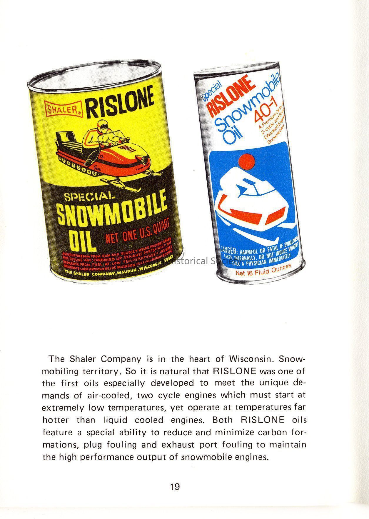 The Shaler Company is in the heart of Wisconsin. Snowmobiling territory. So it is natural that RISLONE was one of the first oils especially developed to meet the unique demands of air - cooled, two cycle engines which must start at extremely low temperatures, yet operate at temperatures far hotter than liquid cooled engines. Both RISLONE oils feature a special ability to reduce and minimize carbon formations, plug fouling and exhaust port fouling to maintain the high performance output of snowmobile engines.