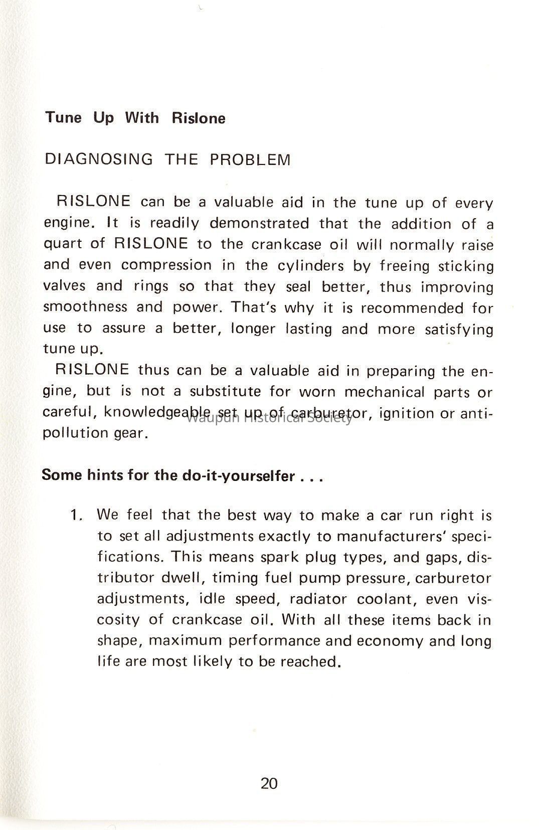 RISLONE thus can be a valuable aid in preparing the engine, but is not a substitute for worn mechanical parts or careful, knowledgeable set up of carburetor, ignition or antipollution gear.