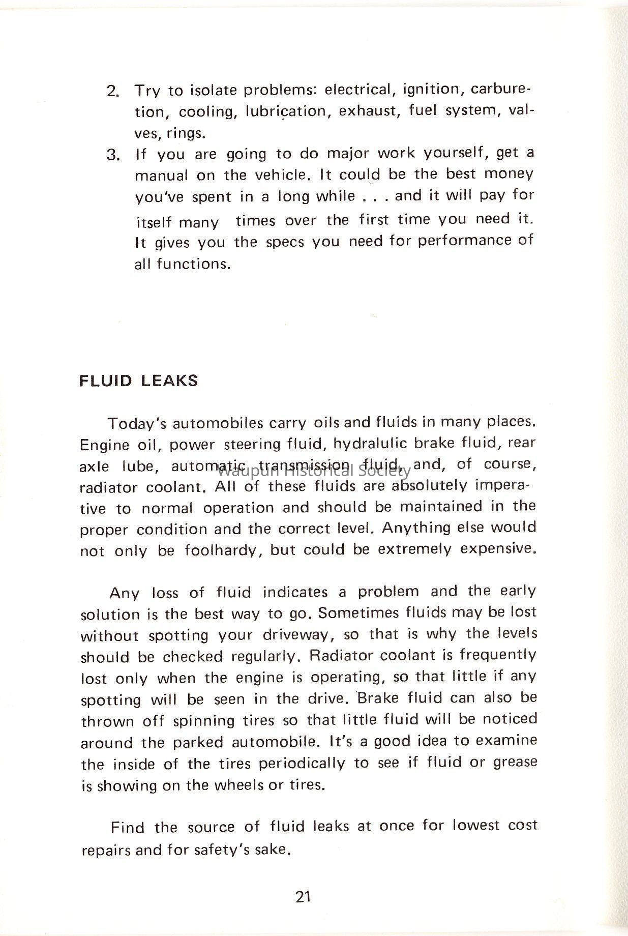 Today's automobiles carry oils and fluids in many places. Engine oil, power steering fluid, hydralulic brake fluid, rear axle lube, automatic transmission fluid, and, of course, radiator coolant. All of these fluids are absolutely imperative to normal operation and should be maintained in the proper condition and the correct level. Anything else would not only be foolhardy, but could be extremely expensive.