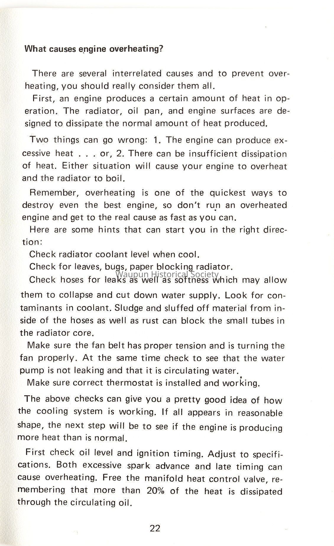 First check oil level and ignition timing. Adjust to specifications. Both excessive spark advance and late timing can cause overheating. Free the manifold heat control valve, remembering that more than 20% of the heat is dissipated through the circulating oil.