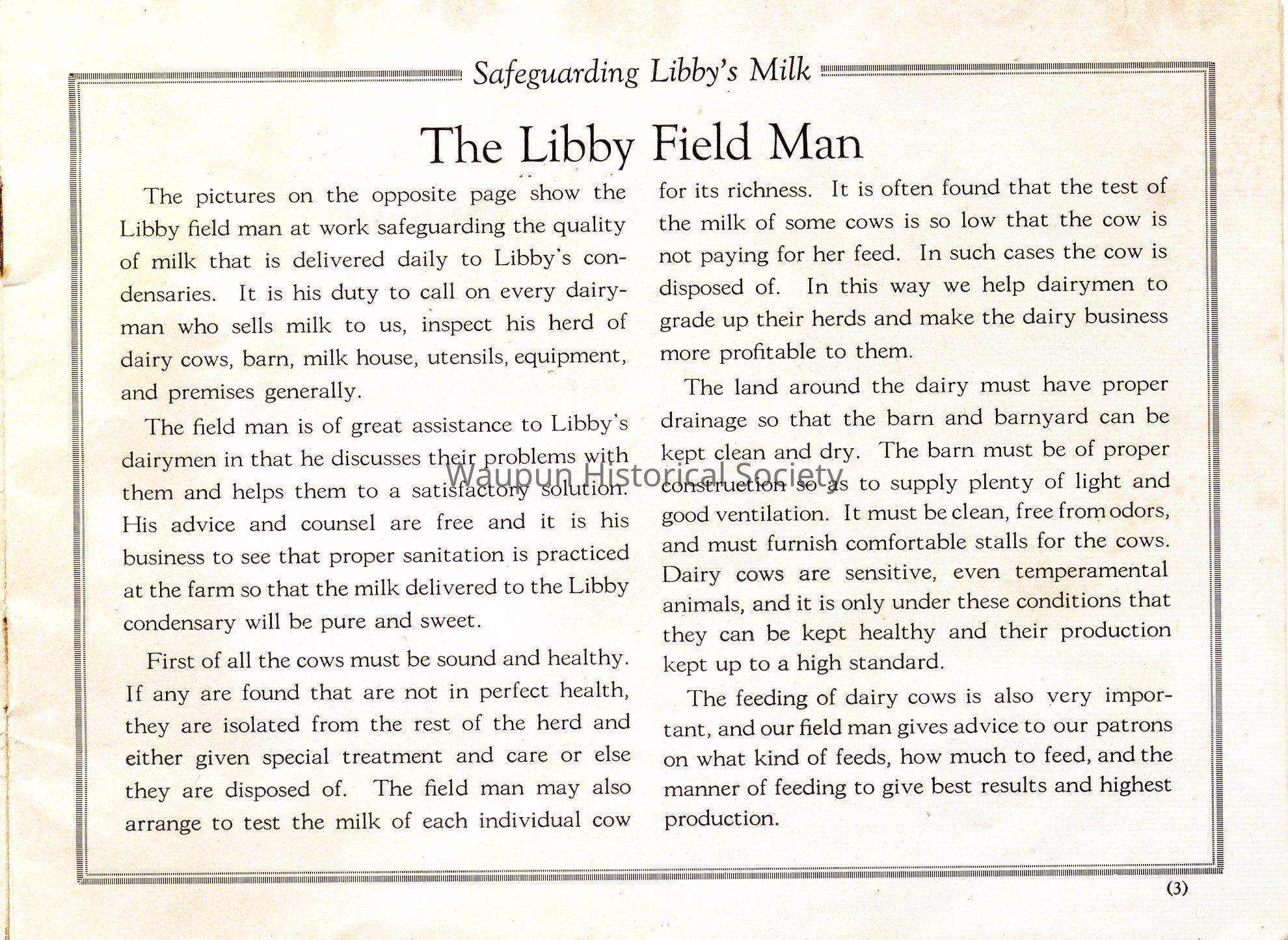 The field man is of great assistance to Libby's dairymen in that he discusses their problems with them and helps them to a satisfactory solution. His advice and counsel are free and it is his business to see that proper sanitation is practiced at the farm so that the milk delivered to the Libby condensary will be pure and sweet.