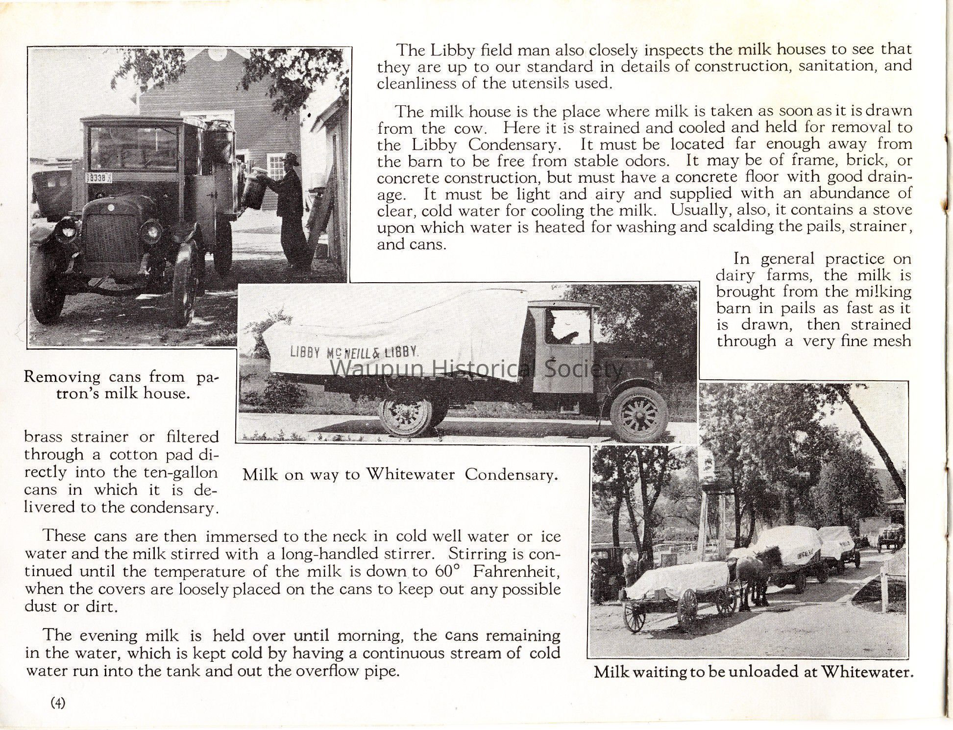 In one of the pictures, one of the haulers of our Whitewater, Wisconsin, condensary, is shown removing cans of milk from the milk house of one of our patrons and loading it onto his automobile truck.