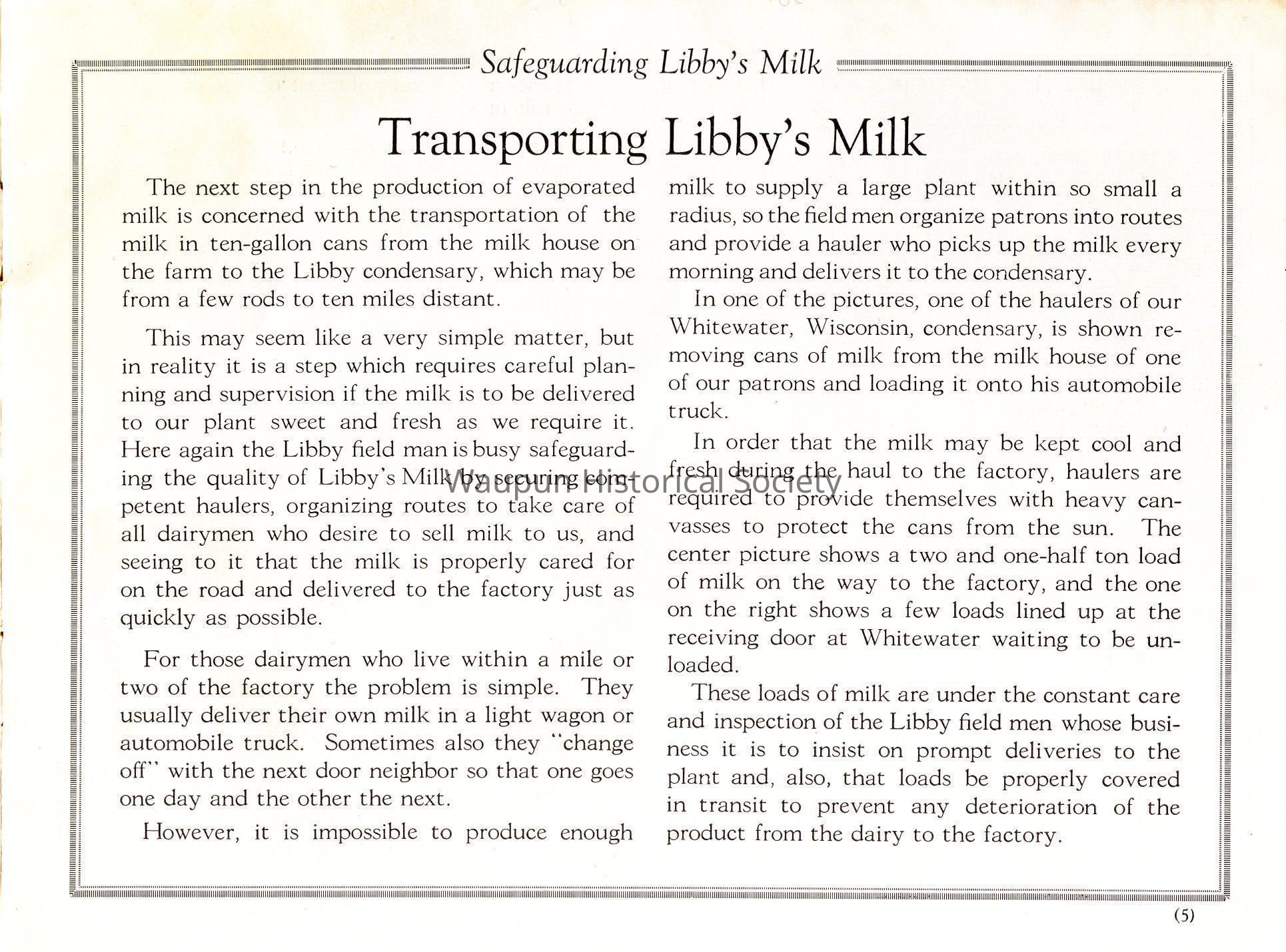 These loads of milk are under the constant care and inspection of the Libby field men whose business it is to insist on prompt deliveries to the plant and, also, that loads be properly covered in transit to prevent any deterioration of the product from the dairy to the factory.