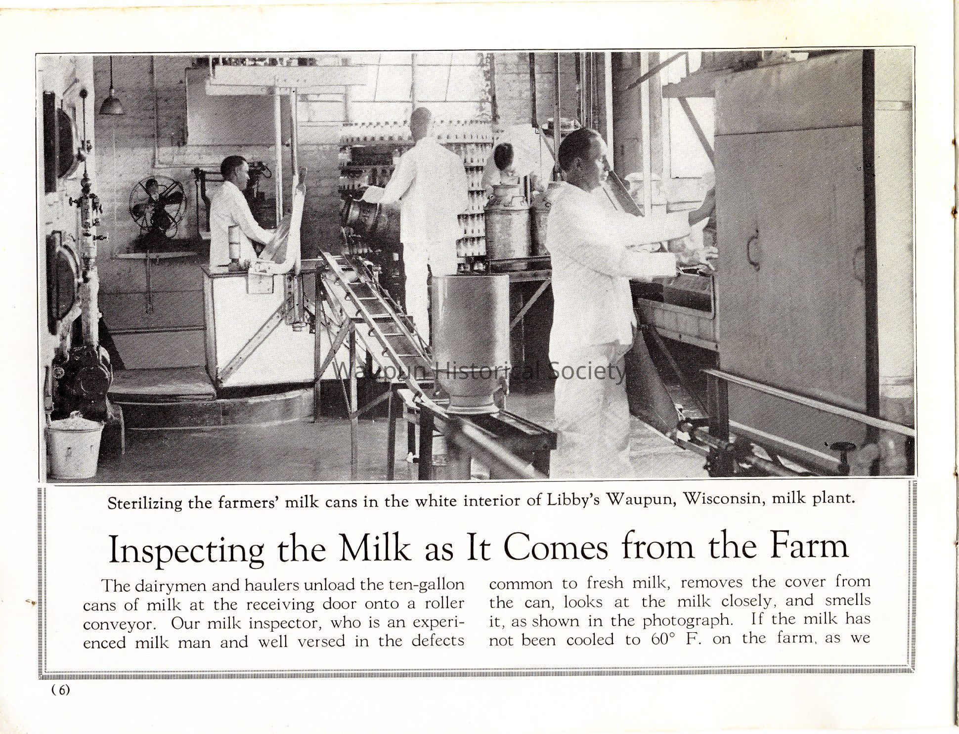 Caption under photo: [Sterilizing the farmers' milk cans in the white interior of Libby's Waupun, Wisconsin, milk plant.]