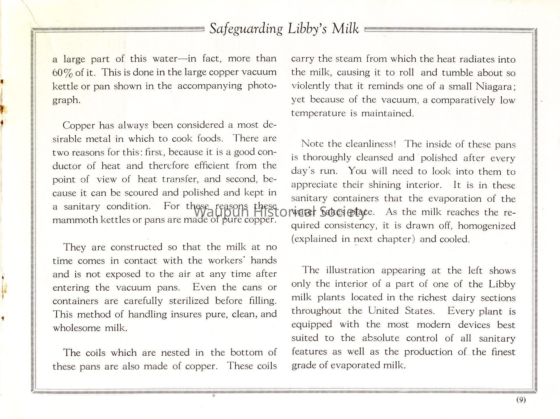 The illustration appearing at the left shows only the interior of a part of one of the Libby milk plants located in the richest dairy sections throughout the United States. Every plant is equipped with the most modern devices best suited to the absolute control of all sanitary features as well as the production of the finest grade of evaporated milk.