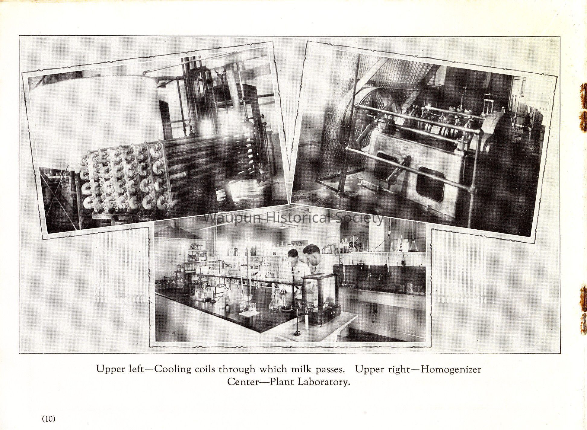 Caption under photos: [Upper left—Cooling coils through which milk passes. Upper right—Homogenizer