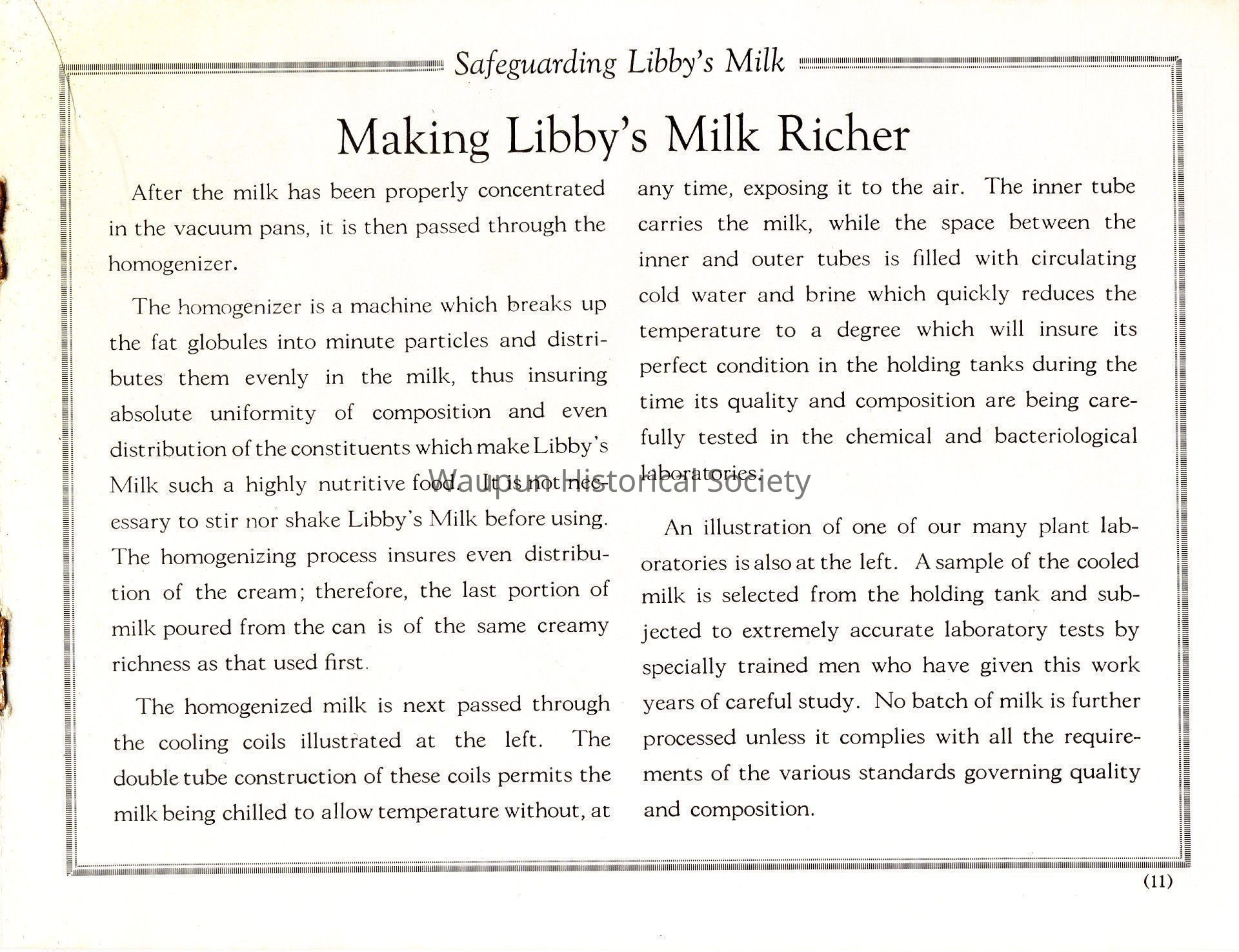 An illustration of one of our many plant laboratories is also at the left. A sample of the cooled milk is selected from the holding tank and subjected to extremely accurate laboratory tests by specially trained men who have given this work years of careful study. No batch of milk is further processed unless it complies with all the requirements of the various standards governing quality and composition.