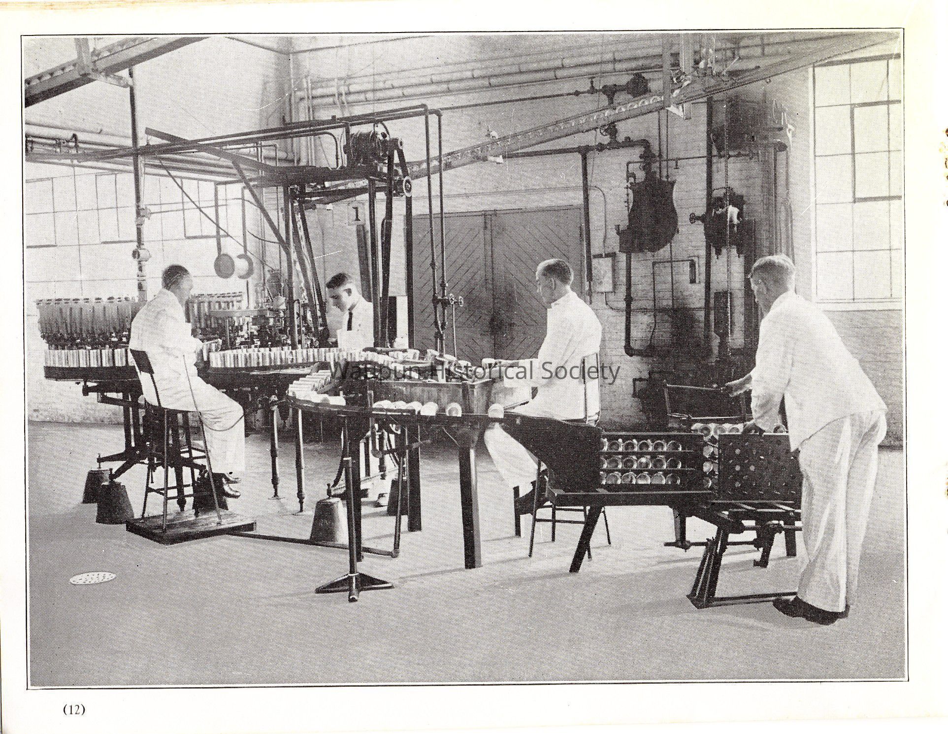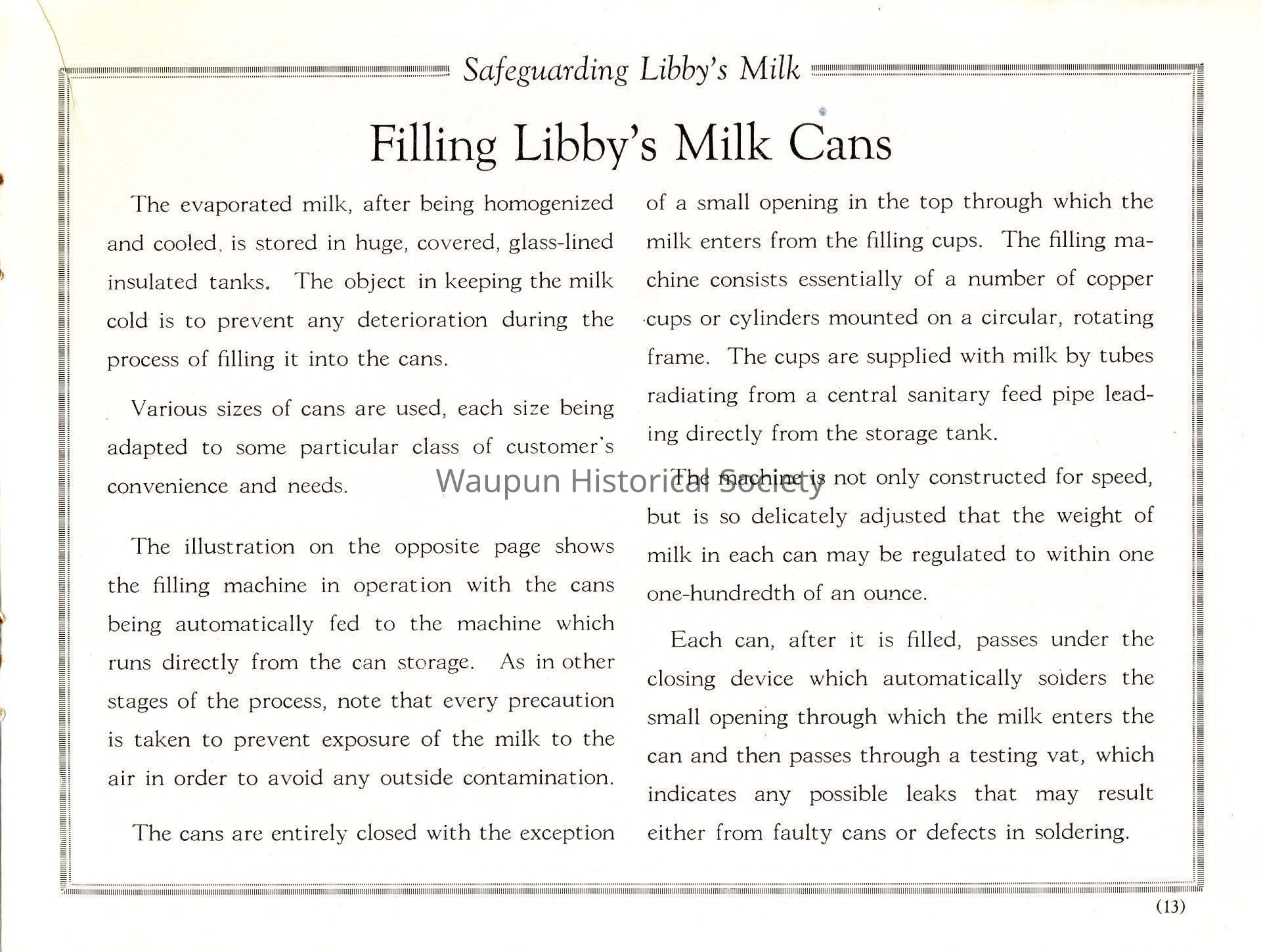 Each can, after it is filled, passes under the closing device which automatically solders the small opening through which the milk enters the can and then passes through a testing vat, which indicates any possible leaks that may result either from faulty cans or defects in soldering.