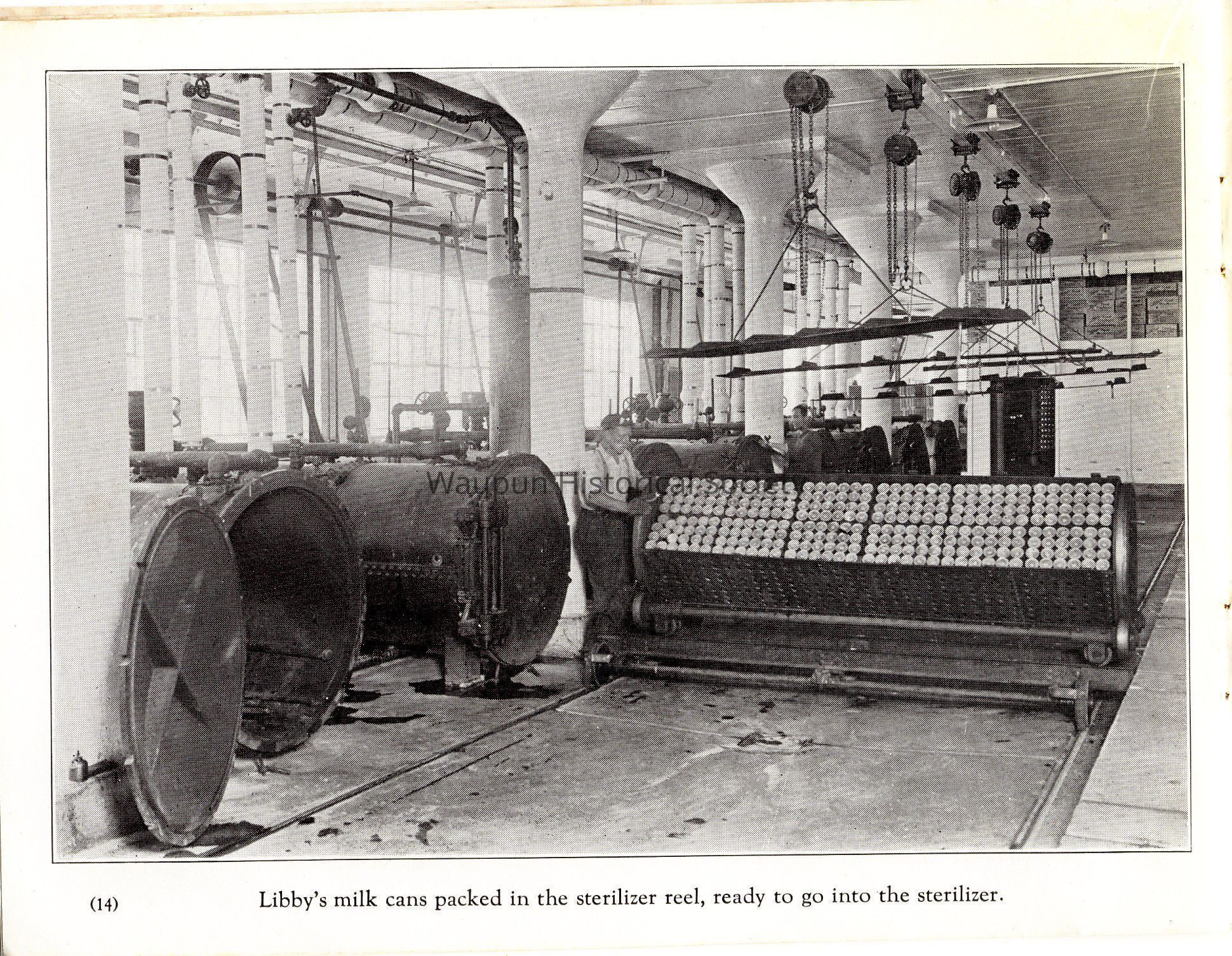 Caption under photo: [Libby's milk cans packed in the sterilizer reel, ready to go into the sterilizer.]