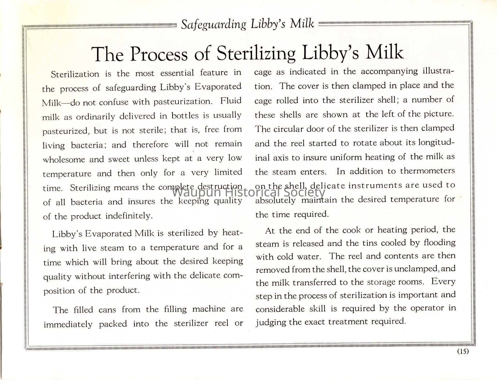 Sterilization is the most essential feature in the process of safeguarding Libby's Evaporated Milk - do not confuse with pasteurization. Fluid milk as ordinarily delivered in bottles is usually pasteurized, but is not sterile; that is, free from living bacteria; and therefore will not remain wholesome and sweet unless kept at a very low temperature and then only for a very limited time. Sterilizing means the complete destruction of all bacteria and insures the keeping quality of the product indefinitely.
