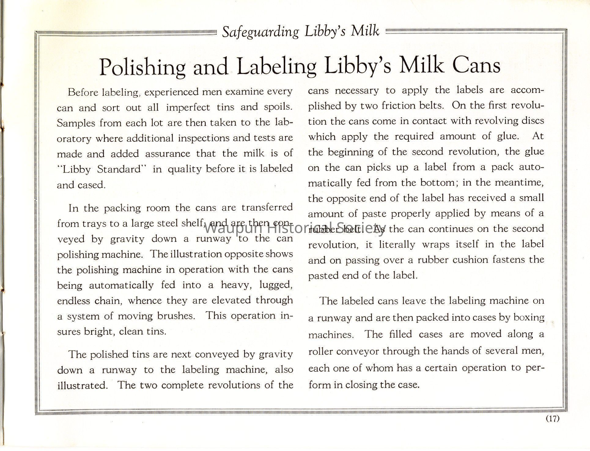 Before labeling, experienced men examine every can and sort out all imperfect tins and spoils. Samples from each lot are then taken to the laboratory where additional inspections and tests are made and added assurance that the milk is of "Libby Standard" in quality before it is labeled and cased.