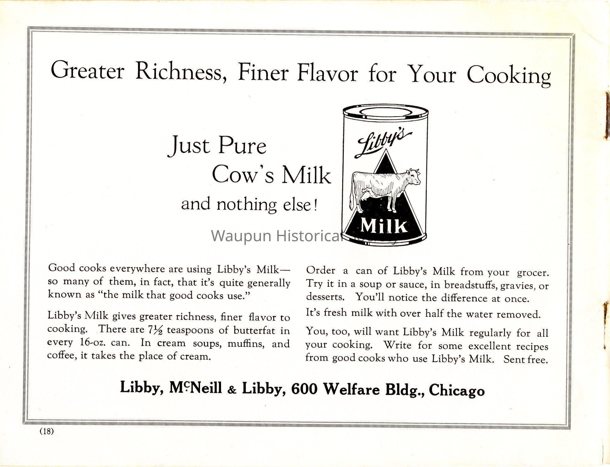 Libby's Milk gives greater richness, finer flavor to cooking. There are 7 1/2 teaspoons of butterfat in every 16 - oz. can. In cream soups, muffins, and coffee, it takes the place of cream.