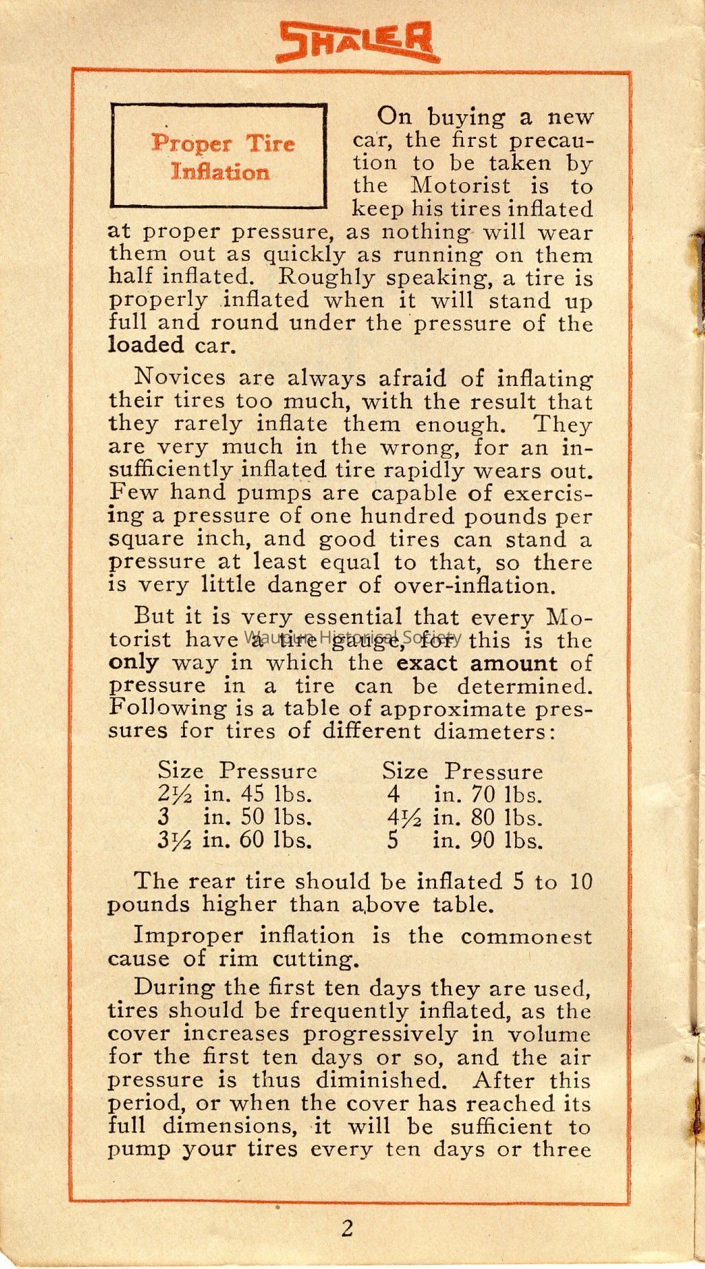 On buying a new car, the first precaution to be taken by the Motorist is to keep his tires inflated at proper pressure, as nothing will wear them out as quickly as running on them half inflated. Roughly speaking, a tire is properly inflated when it will stand up full and round under the pressure of the loaded car.