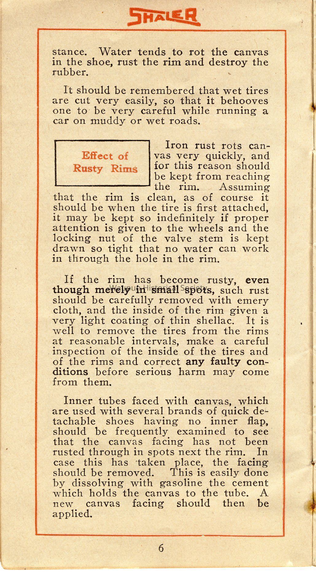 If the rim has become rusty, even though merely in small spots, such rust should be carefully removed with emery cloth, and the inside of the rim given a very light coating of thin shellac. It is well to remove the tires from the rims at reasonable intervals, make a careful inspection of the inside of the tires and of the rims and correct any faulty conditions before serious harm may come from them.