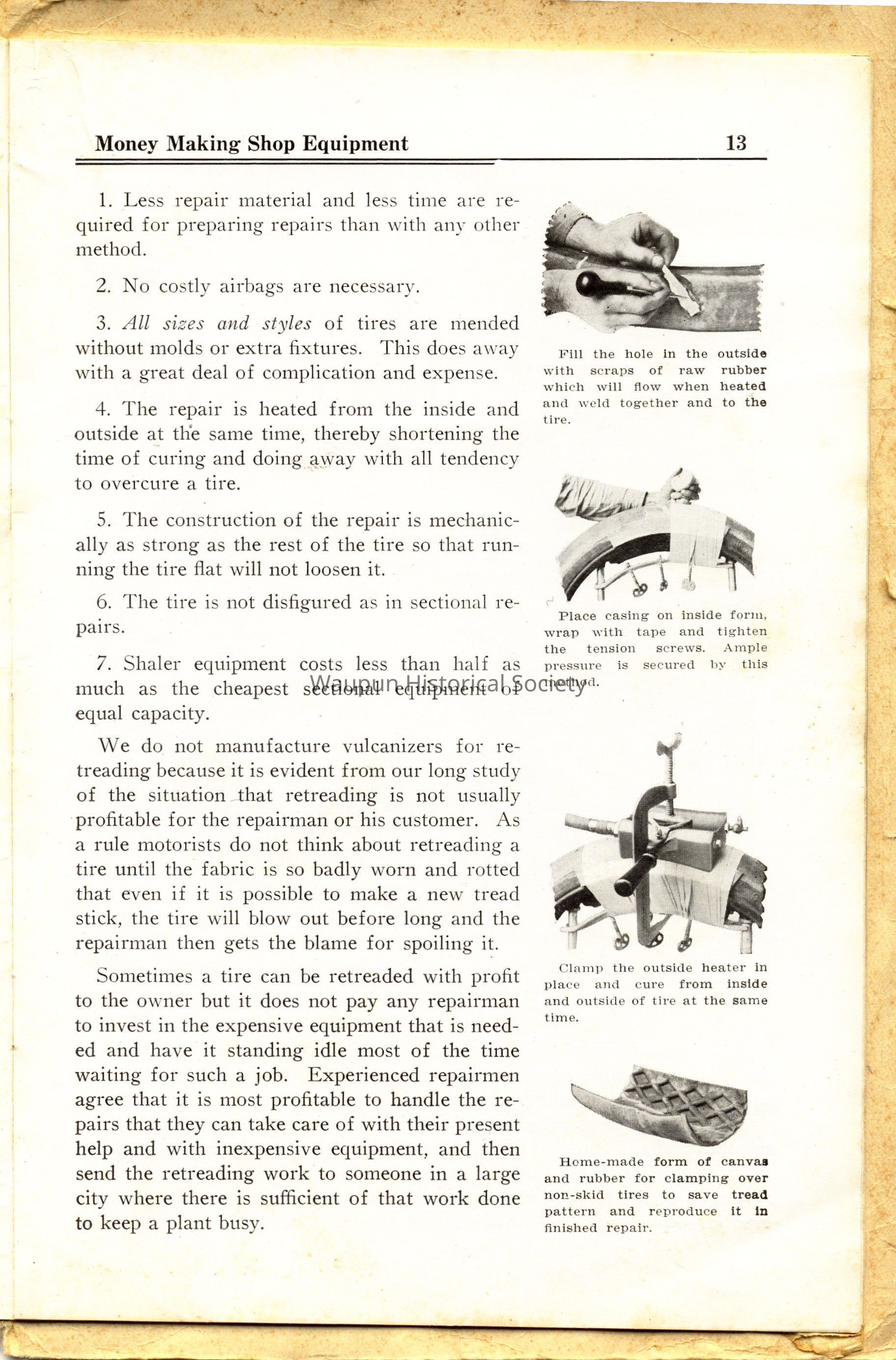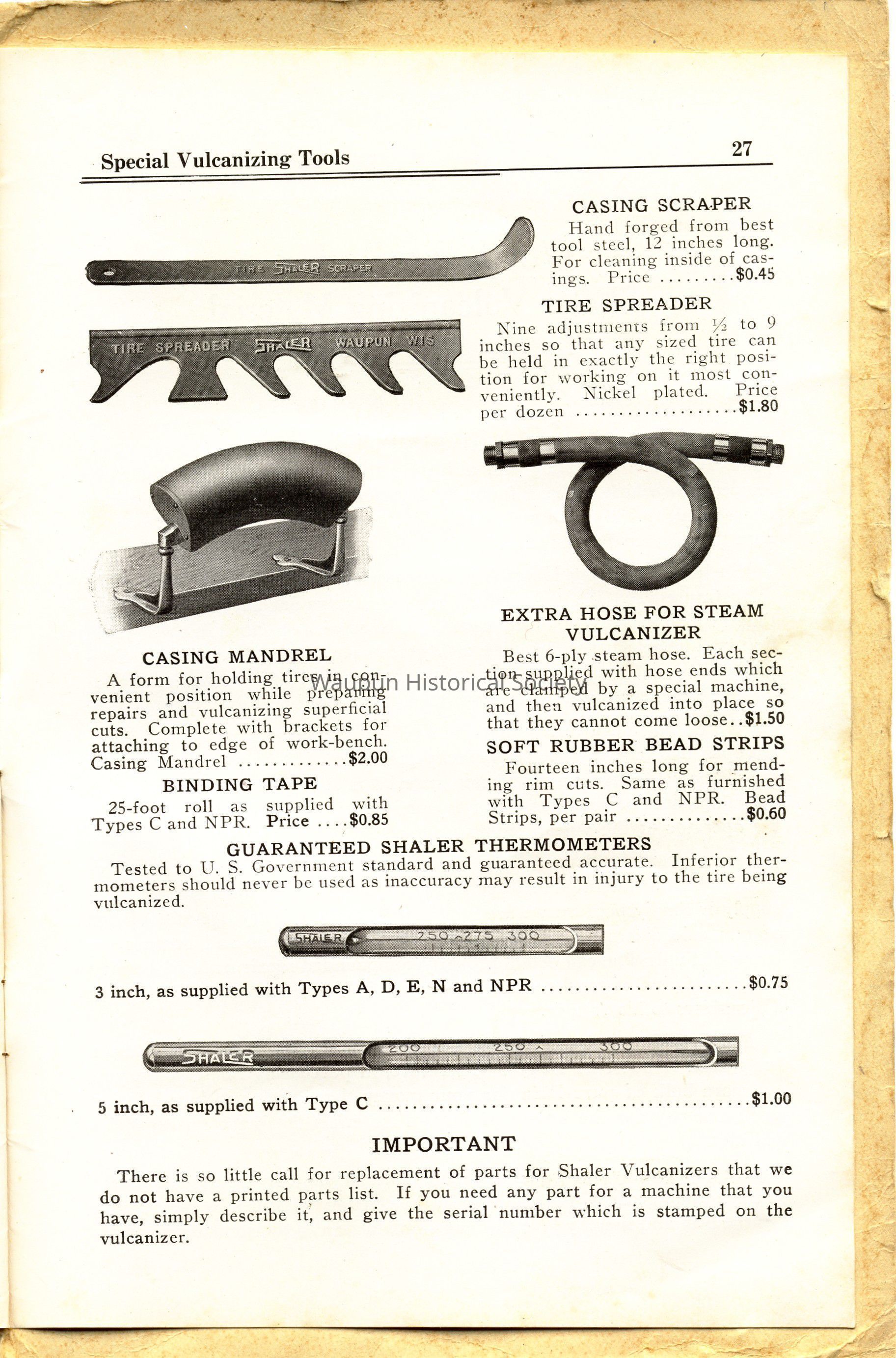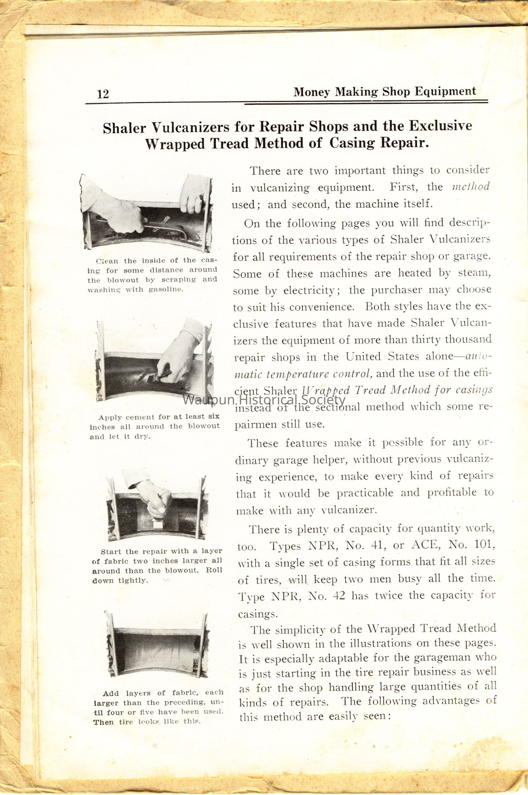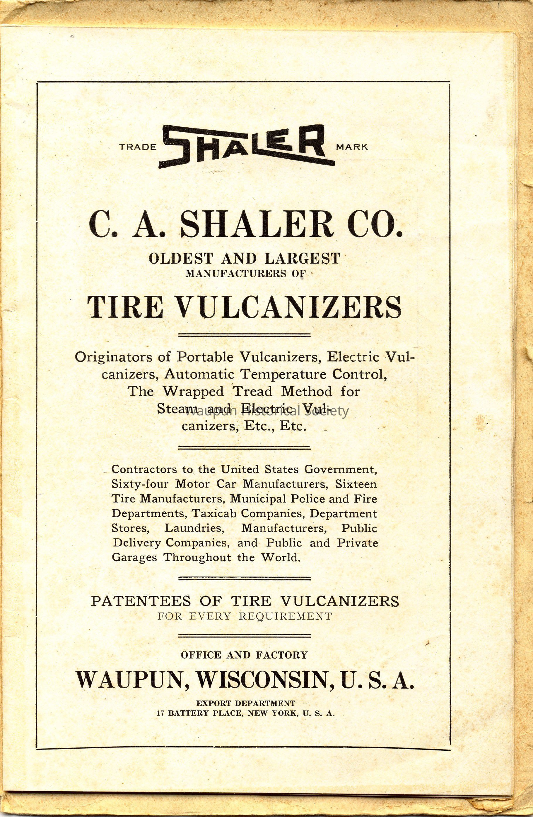 Shaler Vulcanizers for Repair Shops and the Exclusive Wrapped Tread Method of Casing Repair.